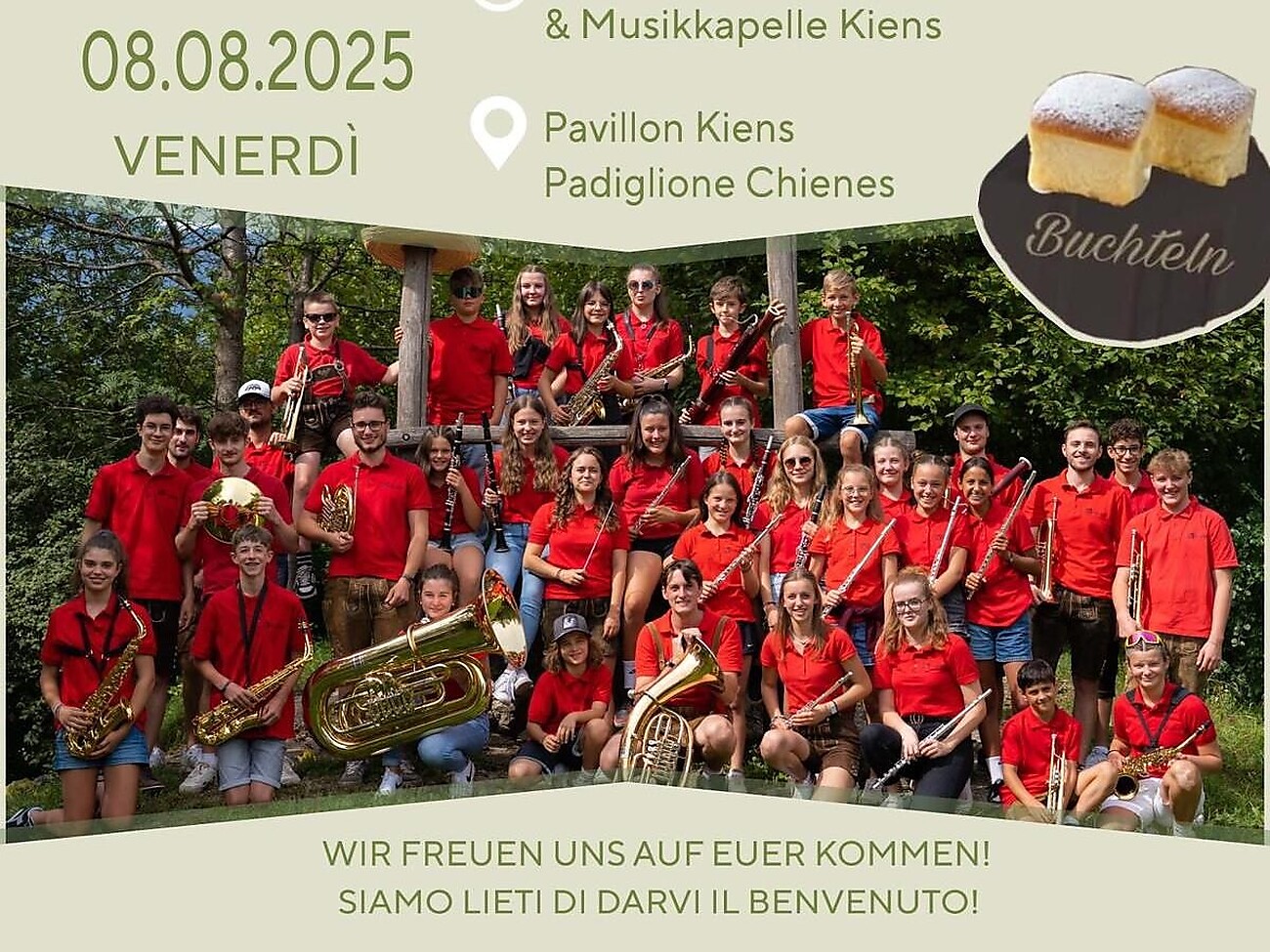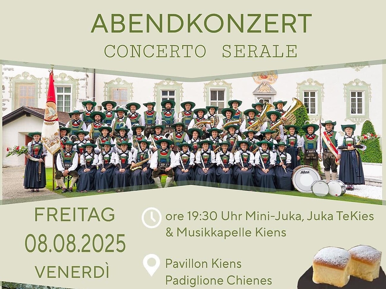 Abendkonzert der Mini-Juka, Juka TeKies und Musikkapelle Kiens beim Vereinshaus von Kiens. Beginn 19.30 Uhr.