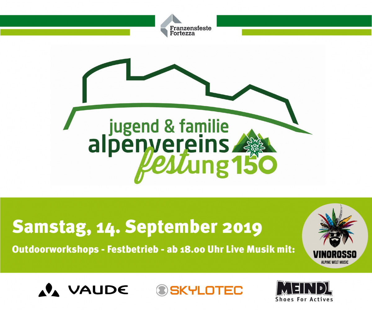Für das große Jugend- und Familienfest am Samstag, den 14. September 2019 anlässlich der Feierlichkeiten "150 Jahre Alpenverein in Südtirol" wurde mit der Franzensfeste ein ganz besonderer Austragungsort gewählt. Das Gelände des oberen Festungsteils, am und rund um den dortigen Klettergarten, eignet sich ideal für die vielseitigen Spiel- und Lernstationen bei diesem Jahreshighlight. Auf die kleinen und großen BesucherInnen warten neben Führungen durch die imposante, bald 200 Jahre alte Festung allen voran eine Reihe spannender Outdoor-Workshops: