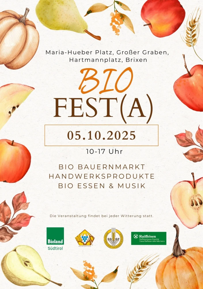 Am Sonntag, 5. Oktober 2025 findet das Biofest(a) im Stadtzentrum von Brixen (Großer Graben, Hartmannplatz und Maria Huber Platz) statt. Ein Treffpunkt für Direktvermarkter und Ab-Hof-Verkäufer aus der biologischen Landwirtschaft, Handwerker und Handwerkerinnen mit ihren selbstgemachten Produkten und für KonsumentInnen, die die ökologische Anbauweise schätzen.