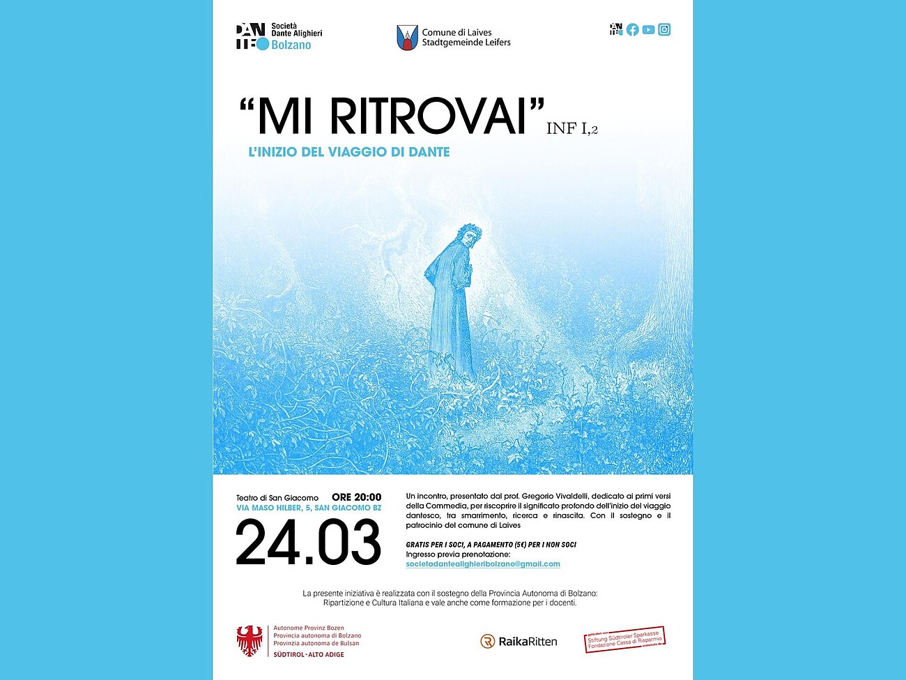 Anlässlich des Dantedì beteiligt sich die Gemeinde Leifers in diesem Jahr dank einer neuen, prestigeträchtigen Zusammenarbeit mit der Società Dante Alighieri in Bozen an den Feierlichkeiten zu Ehren des großen Dichters.