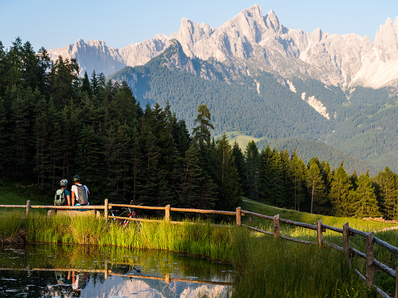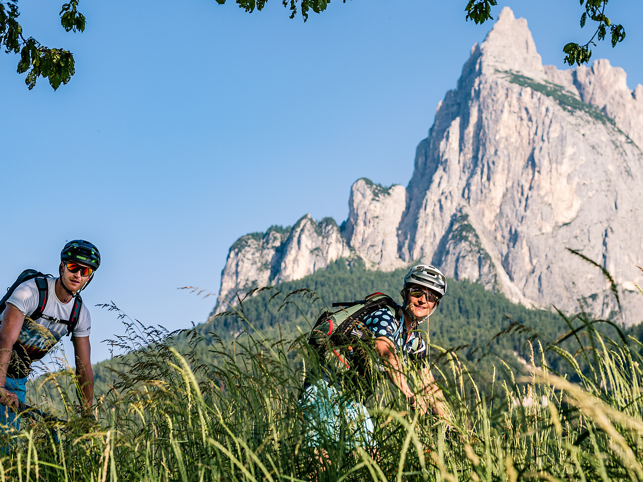 Von Wolkenstein geht es auf der alten Bahntrasse zuerst in Richtung St. Ulrich. Weiter wird auf der asphaltierten Pineiesstraße bis zum Panider Sattel gefahren. Kurz vor Kastelruth biegt links eine Forststraße in Richtung Tiosels ab. Vorbei an St. Valentin gelangt man schließlich zur Talstation der Seiser Alm Bahn in Seis. Der weitere Streckenverlauf führt in Richtung Süden bis zum Völser Weiher. Die Rückkehr erfolgt mit der Umlaufbahn empor zur Seiser Alm und mit dem E-Bike zurück zum Ausgangspunkt.