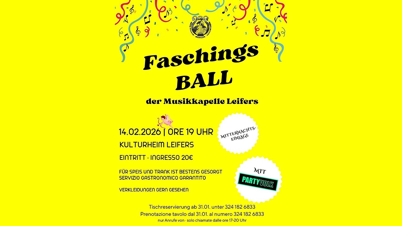 Am 14. Februar 2026 lädt die Musikkapelle Leifers zum Faschingsball ins Kulturheim Leifers ein.