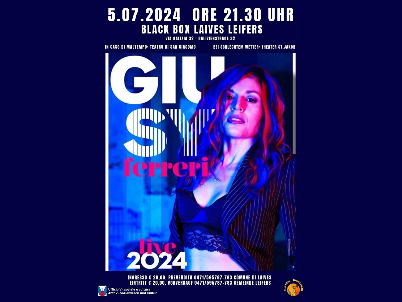 Konzert der italienischen Sängerin Giusy Ferreri in der Black Box in Leifers. Infos & Kartenvorverkauf: Gemeinde Leifers T +39 0471 595787 oder T +39 0471 595783