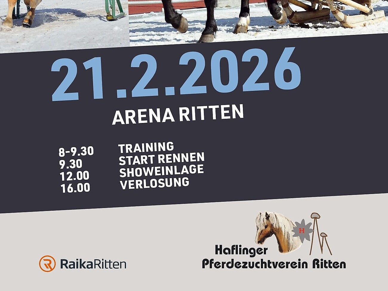 organisiert vom Haflinger Pferdezuchtverein Ritten am Eisring der Ritten Arena in Klobenstein. Start der Rennen um 9.30 Uhr. Für Speis und Trank ist bestens gesorgt