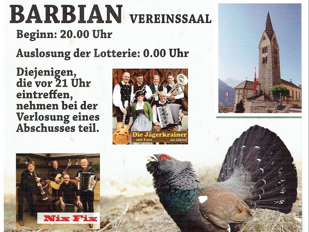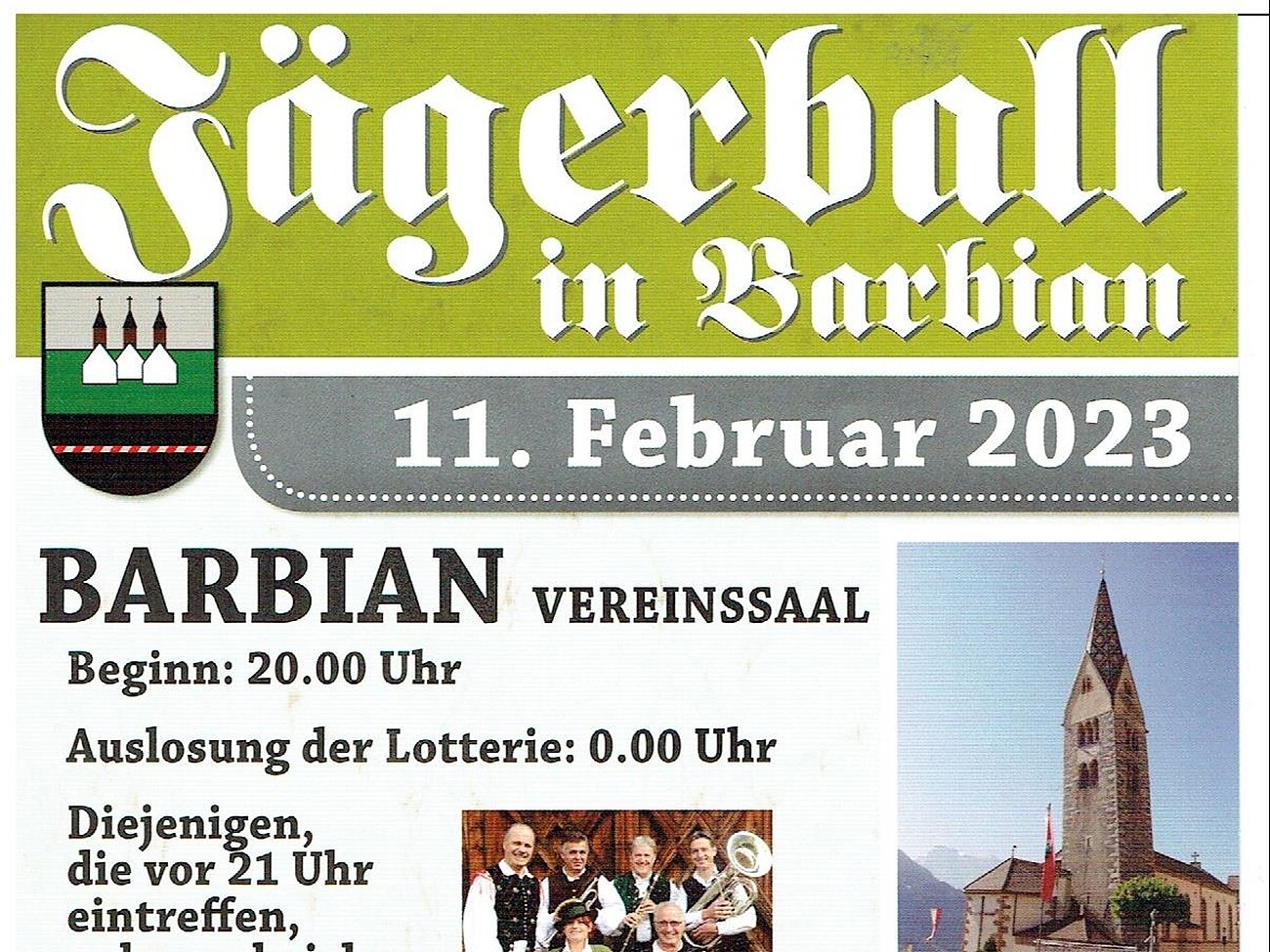 Jägerball im Vereinshaus in Barbian mit Beginn um 20.00 Uhr.