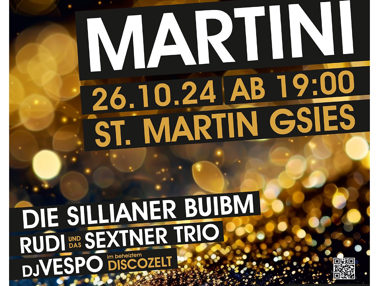 Gsiesertal – St. Martin ab 19:00 Uhr. Musikalische Unterhaltung mit die Sillianer Buibm, Rudi und das Sextner Trio, DJ Vespo im beheiztem Diskozelt. Kulinarische Spezialitäten der Starköchin Tina Marcelli & Team. Lotterie. Verpassen Sie nicht diesen festlichen Abend voller Musik, Tanz und Genuss!