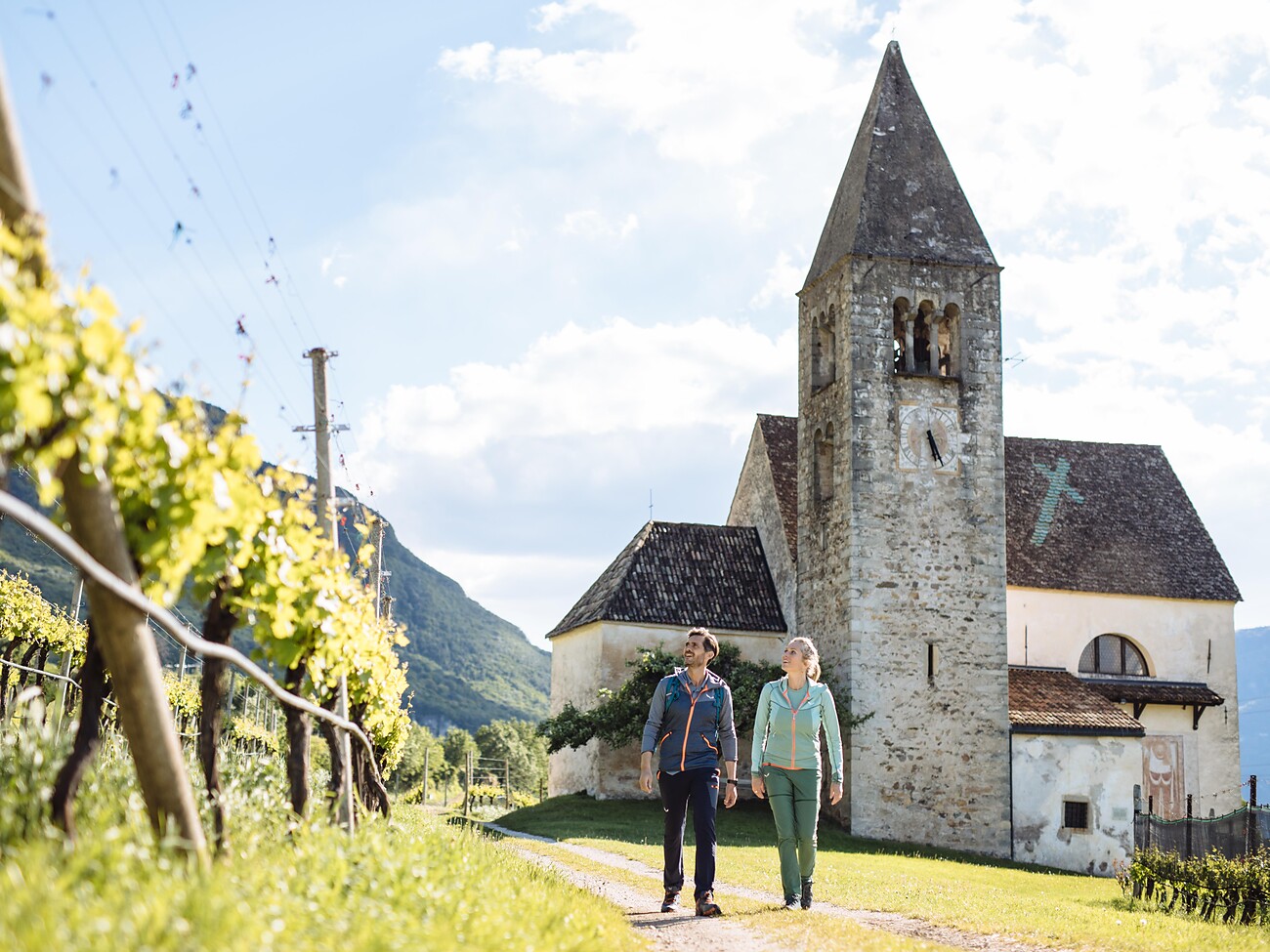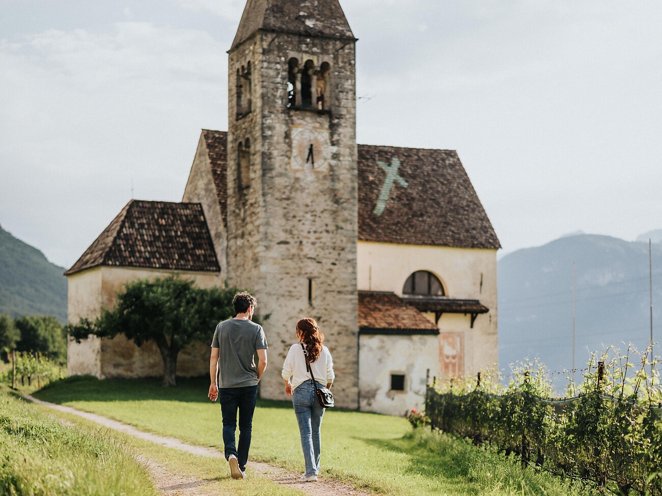 Vom historischen Zentrum von Neumarkt mit seinen bekannten Laubengängen wandern wir über den Geigerhäuslsteig in den Blauburgunderhimmel von Mazon. Wir flanieren am Fuße des Naturparks Trudner Horn durch herrliche Weinberge und erfahren allerlei spannende Geschichten über die Marktgemeinde Neumarkt, einen der schönsten Ortskerne Italiens, den Weinanbau und die zahlreichen historischen Schätze am Wegesrand, vom Castel Kaldiff bis hin zur romanischen St. Michael-Kirche. Die Tour ist familienfreundlich gestaltet und informative Schautafeln geben zahlreiche Einblicke in das Gebiet und seine Menschen. Schöne Aussichtspunkte auf das gesamte Etschtal und den Kalterer See belohnen die Wanderer auf ihrem Weg.