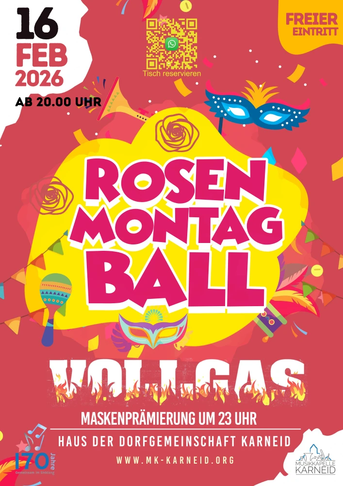 Rosenmontagball der Musikkapelle Karneid im Haus der Dorfgemeinschaft von Karneid