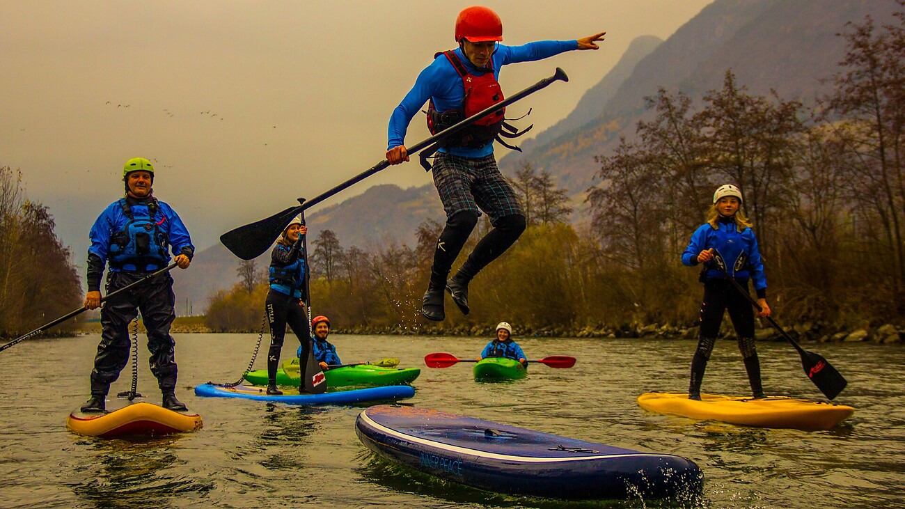 Stellen Sie Ihr Gleichgewicht auf die Probe und paddeln Sie in Begleitung eines Guides vom Rafting Adventure Südtirol der Etsch entlang.