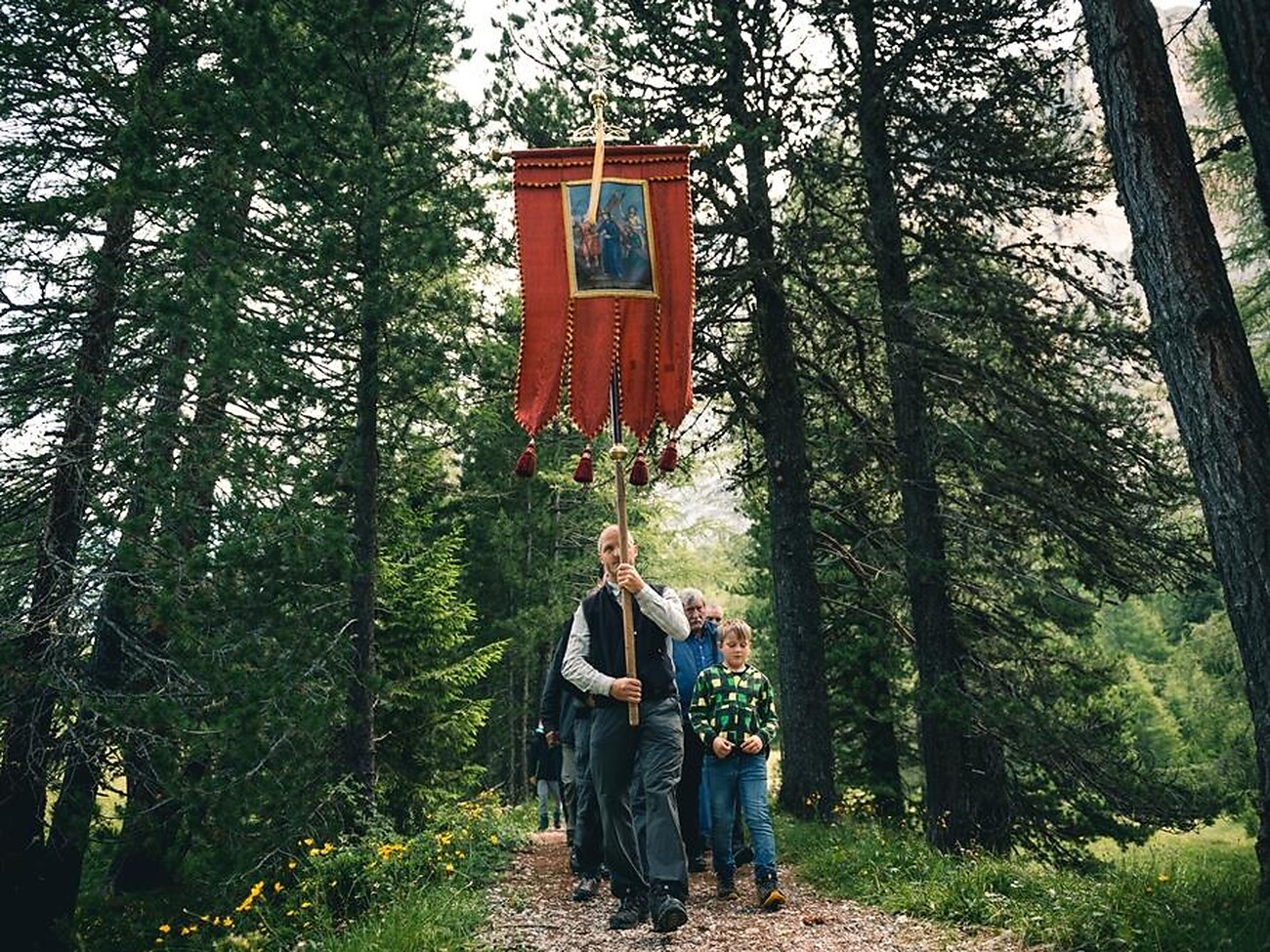 Religiöse Prozession zur Wallfahrtskirche La Crusc/Heiligkreuz.