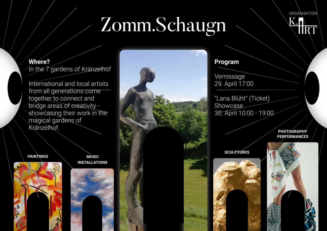 Am 29. und 30. April stellt der Kulturverein K.art in den 7 Gärten des Kränzelhof’s, jungen Künstlern den Raum zu Verfügung, sich zu zeigen. Junge Kultur braucht Freiräume sich auszudrücken, sei es in der Musik, sowie in der Bildhauerei, Malerei, Fotografie, LandArt, Installationen, was auch immer sie bewegt. Es geht um ein Miteinander junger Kulturschaffender, die unkonventionelle Wege bestreiten, in einem unverwechselbaren Rahmen zu überraschen.