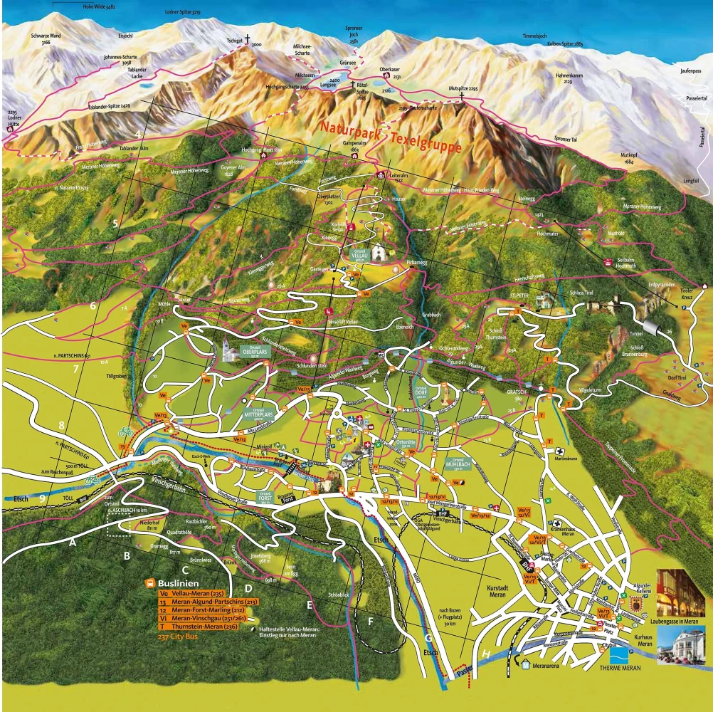 Halbstündlich fährt der Bus von Algund über Algund Dorf zum Meraner Bahnhof und der Therme von Meran. Im Rhythmus von einer Stunde werden abwechselnd die Algunder Fraktionen Plars sowie die Zone Moarhöfe/Forst mit direkter Weiterfahrt nach Meran angefahren.
