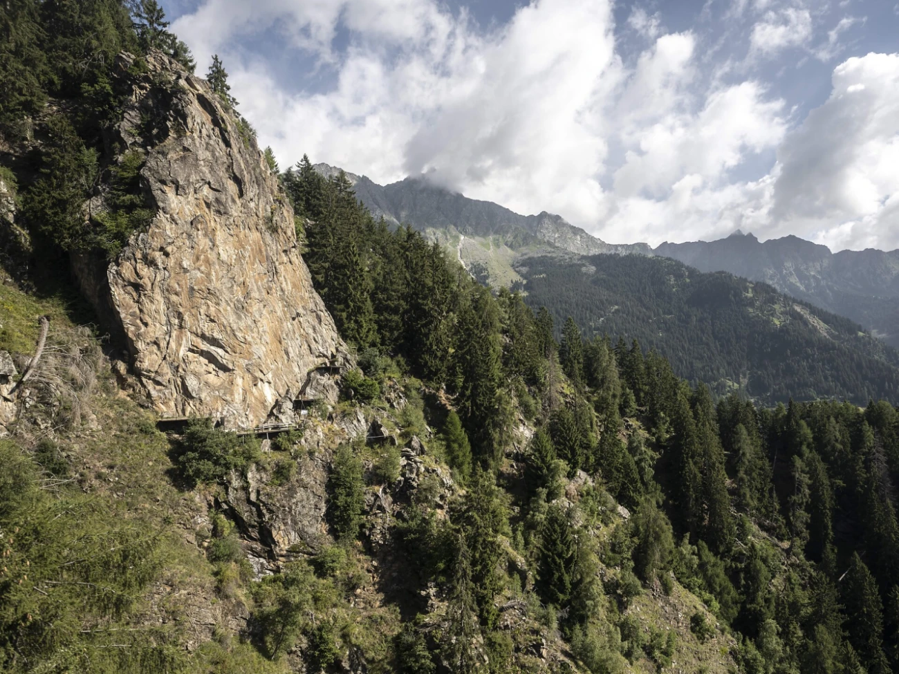 Bequem über die Panorama-Seilbahn Texelbahn in Partschins zur Bergstation. Gleich unterhalb der Bergstation führt ein Steg bergab (Wanderweg Nr. 2 / Verbindungsweg Durster-Giggelberg). Diesem folgt man ca. 5 Minuten, bis man zu einem Steinmännchen kommt. Hier rechts abbiegen und dem Steig bis zum Wandfuß folgen.
