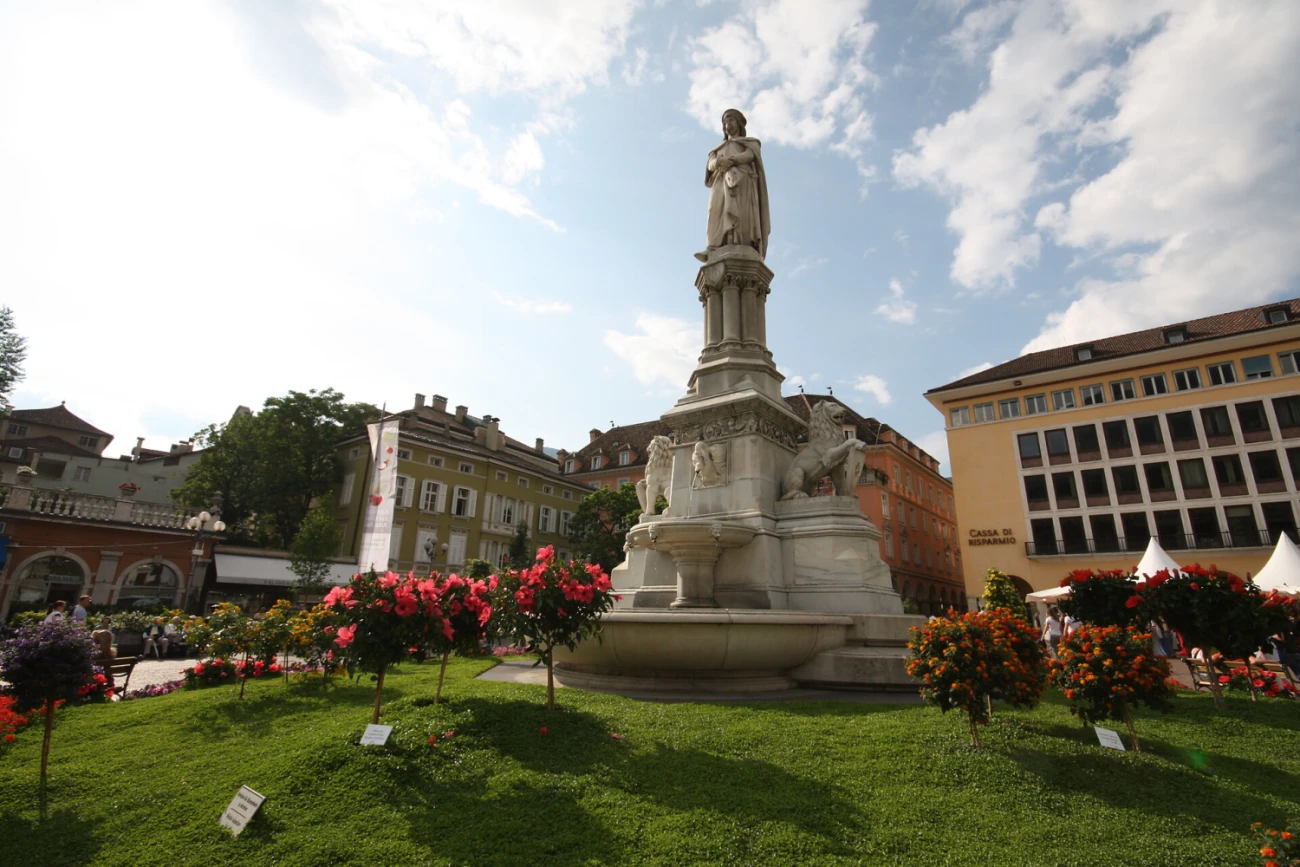 Walther von der Vogelweide ist als Denkmal gegenwärtig, vom Vinschger Bildhauer Heinrich Natter 1889 in weißem Marmor gemeißelt. Das Denkmal wurde während des Faschismus vom Platz entfernt und in den Roseggerpark (Marconistraße) verlegt, um dann 1985 an seinen ursprünglichen Standort zurückzukehren.