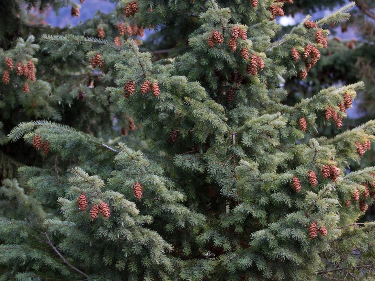 Früchte: braune Zapfen mit weit hervorragenden Deckschuppen