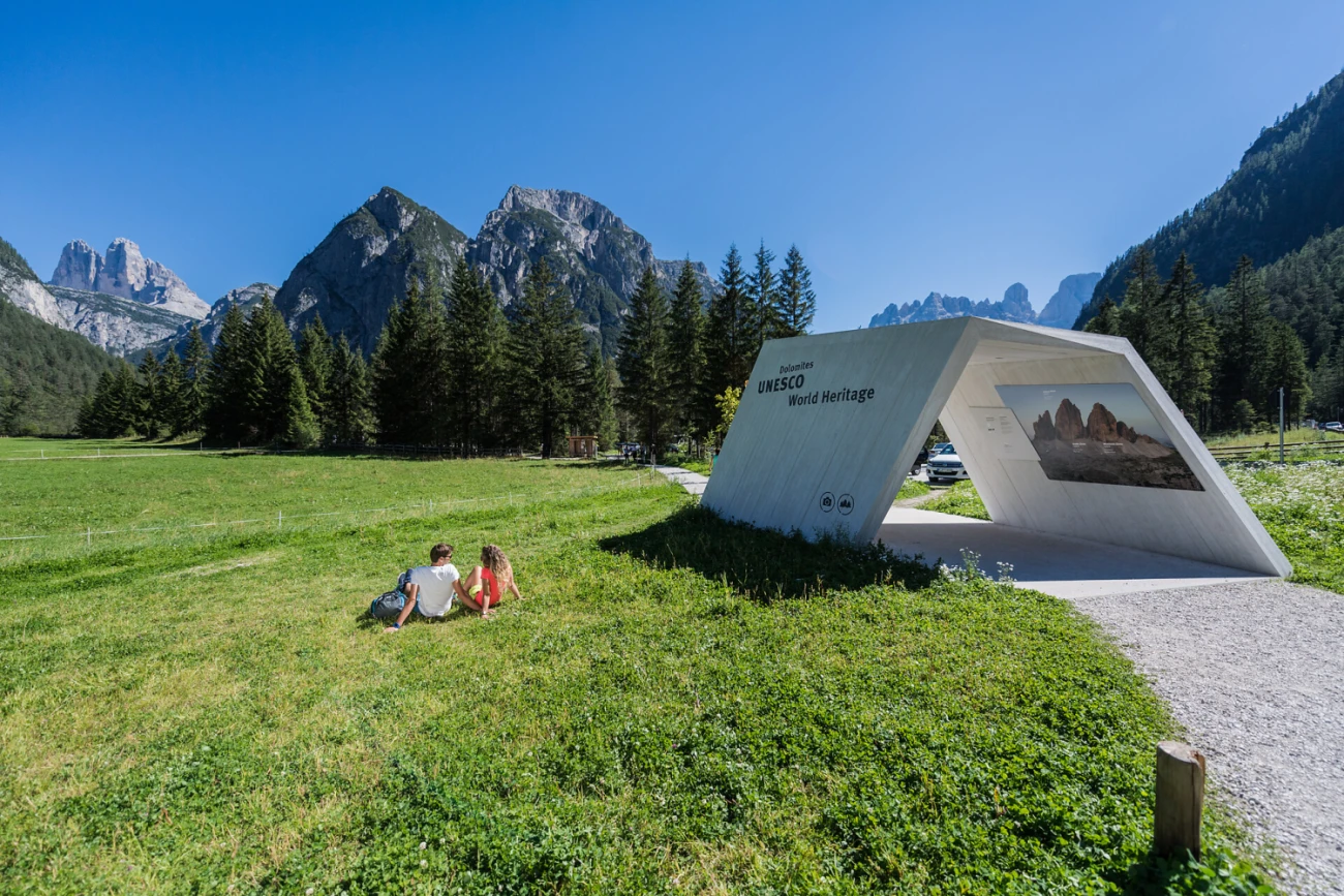 Ein Portal weist auf den Aussichtspunkt hin. Dieses versinnbildlicht die Auffaltungen der Berge. Die Ausführung in Beton aus Dolomitgestein nimmt Bezug auf die nahegelegenen Festungsbauten, die Ende des 19. Jahrhunderts von Österreich zur Absicherung der Grenze errichtet wurden (Südtirol war bis 1918 Teil Österreichs). Eine Plattform aus Holz markiert diesen Aussichtspunkt. Hier gibt es Informationen zur Natur und Landschaft sowie zur Geschichte der bergsteigerischen Erschließung. Durch ein kostenloses Fernrohr können Besucher das Panorama der 3 Zinnen aus der Ferne bewundern. Die bizarren und markanten Felsformationen sind ganz nah, sodass man auch den Kletterern bei ihren vertikalen Herausforderungen zusehen kann. Auf einem nachgebauten Relief sind die wichtigsten Klettertouren an den Nordhängen eingearbeitet und für Blinde abtastbar.