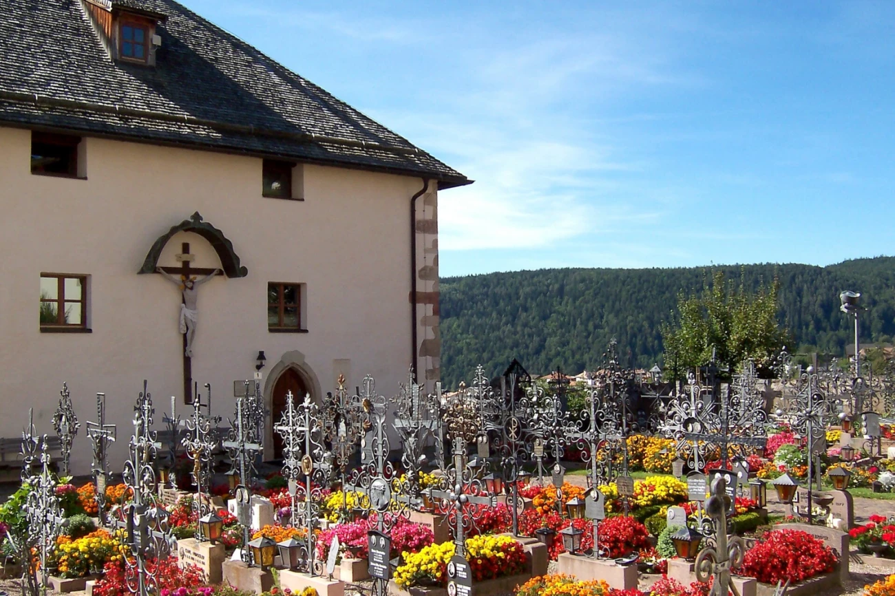 Zinnen, Schießscharten und steinerne Fratzen zieren den gotischen Turm des ehemaligen Pfarrhauses und Schule des Ortes, in dem heute das Rathaus von Jenesien untergebracht ist.