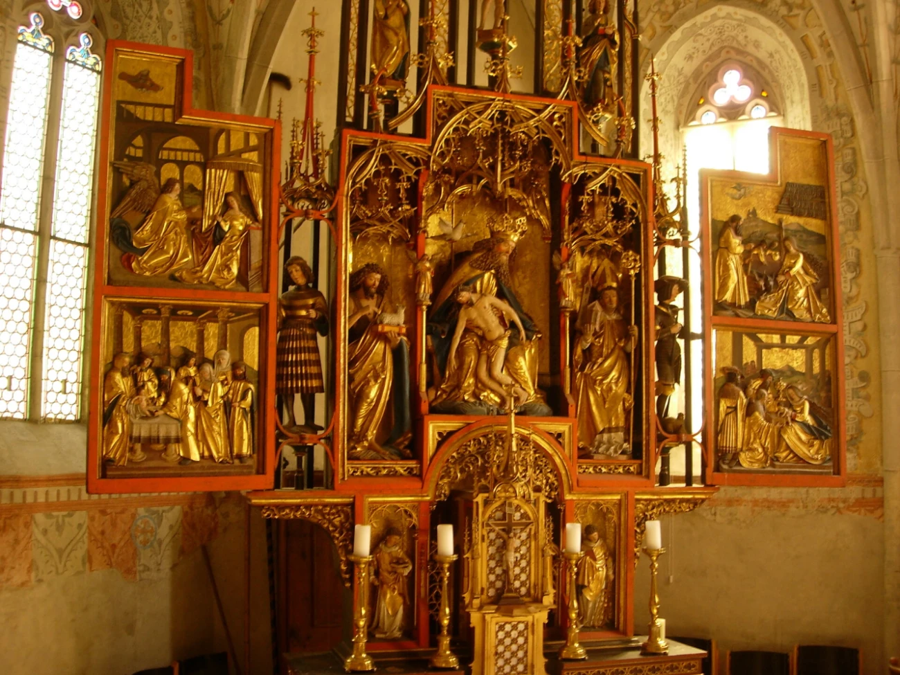Die Kirche ist eine Stiftung des Heinrich von Annenberg. 1470-1520 ist die Kirche zu einem einheitlichen gotischen Bau verschmolzen. Der Flügelaltar des schwäbischen Meisters Jörg Lederer (1524) trägt an der Rückseite meisterliche Malereien, wahrscheinlich von Hans-Leonhard Schäuffelin. Das gotische Portal in weißem Marmor ist ein Werk des Oswald Furter; die Freskenzyklen (Jüngstes Gericht, Werke der Barmherzigkeit, Pfingstwunder, Brotvermehrung u.s.w.) aus der 1. Dekade des 17. Jahrhunderts stammen von Adrian Mair, auch er gebürtig aus Latsch. Barocke Seitenaltäre und Orgel von 1741.