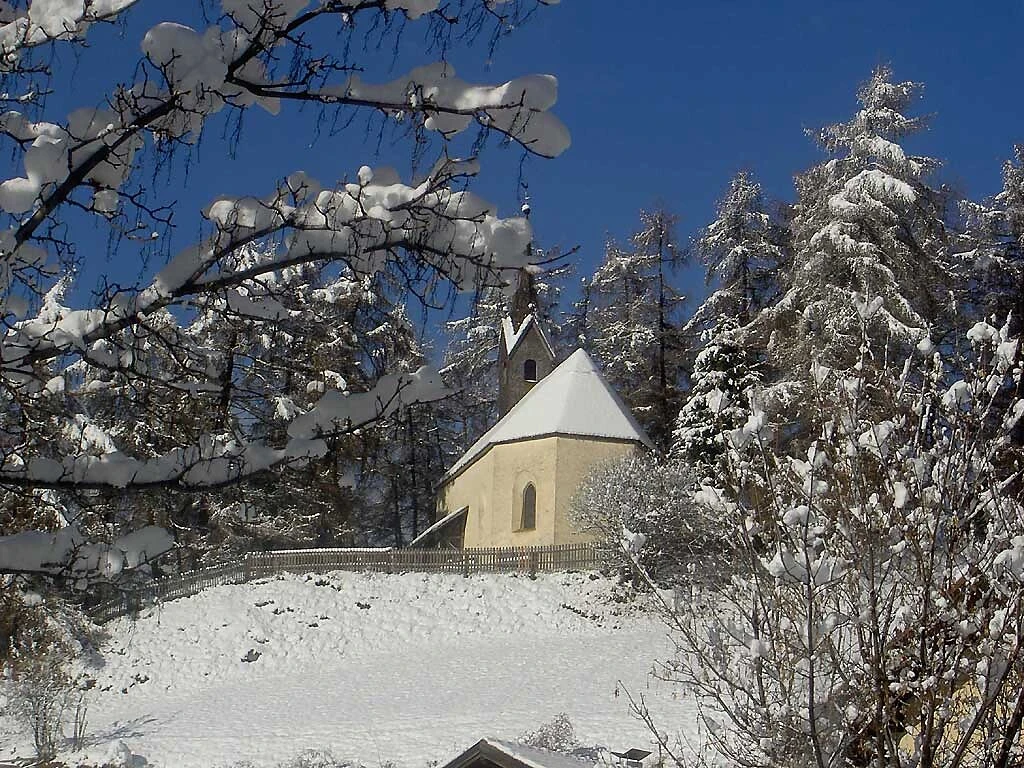 im spätgotischen Stil wurde 1521 eingeweiht. Sie enthält ein um 1600 entstandenes Außenwandfresko des Märtyrers Georg. Im Innern befindet sich ein um 1596 gestifteter Altar in Renaissanceform mit Darstellungen der heiligen Sippe, Mariä Verkündigung, Jakobus, Johannes des Täufers und der Heiligen Agnes. An der Predella findet sich eine Darstellung des Stifters H.J. Khuen von Belasi nebst Ehefrau. Kategorie: Kultur, Sakrale Kunst, Malerei Das St. Anna Kirchlein steht auf einem Hügel mit wunderbarem Blick über den obersten Vinschgau. Archäologen vermuten an der Stelle einen Vorgängerbau oder eine Kultstätte.