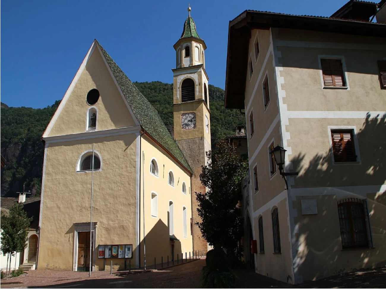An Stelle der heutigen Marienkirche stand im 14. Jahrhundert eine Kirche zu Ehren des Heiligen Jodok. 1674 trat an ihre Stelle ein frühbarockes, der Rosenkranzkönigin geweihtes Kirchenschiff. Vom älteren Vorgänger blieb nur der Unterbau des Glockenturms erhalten. Baumeister waren die Brüder Misconèl aus Tesero im Fleimstal. Der Turmabschluss mit Achtecktambour und Glockenhaube kam 1776/77 hinzu. Das dreijochige Langhaus mit Tonnengewölbe wird von Pilastern und Gurtbögen zwischen Rechteck- und Lünettenfenstern gegliedert. Ein verkröpftes Gesims verbindet es mit dem eingezogenen Rechteckchor. Im Westen zweigeschossiger Emporeneinbau.