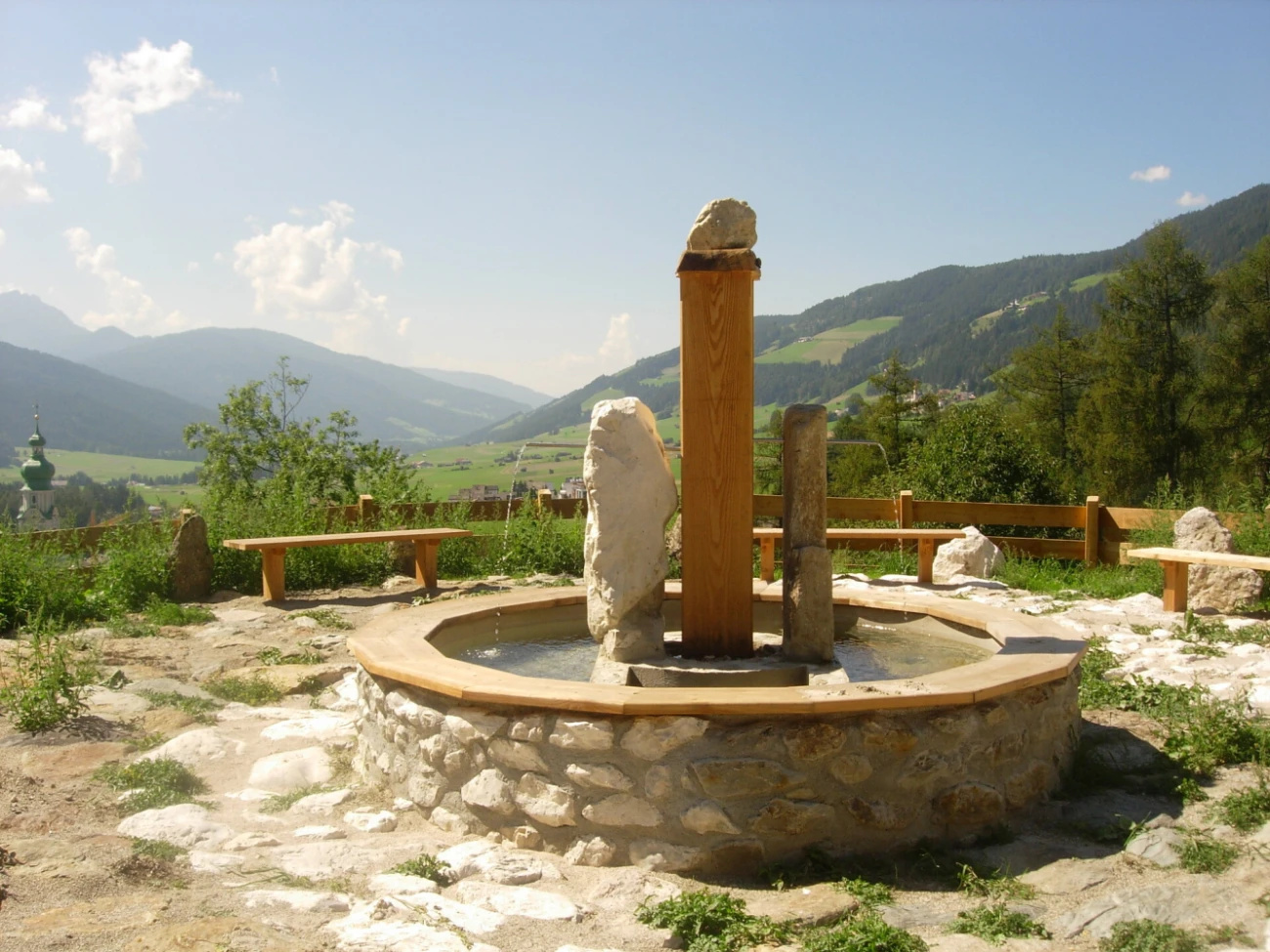 Ein Trinkwasserbrunnen mit idyllischem Aussichtspunkt am Ortsrand von Toblach lädt zur Verkostung des Toblacher ZweiWassers ein.
