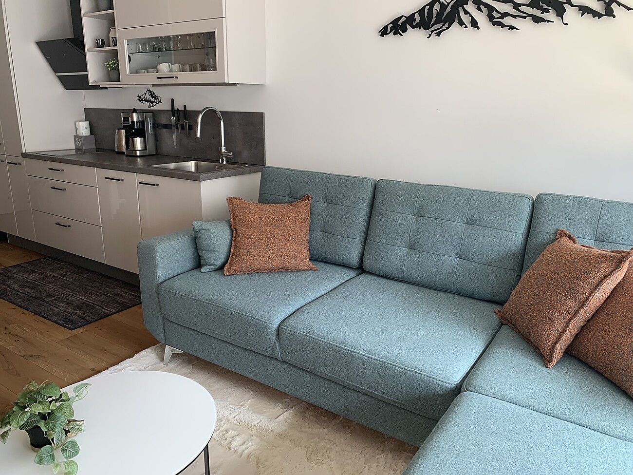 Bequem über den Lift erreichen Sie die sehr modern eingerichtete, stilvolle Wohnung in der ersten Etage. Die gesamte Wohnung wird über eine Fußbodenheizung beheizt. In der voll eingerichteten Küche bereiten Sie selbst Ihre Speisen. Das Schlafzimmer ist mit einem Doppelbett (180x200) ausgestattet. Im Badezimmer finden Sie eine bodentiefe Dusche, ein WC, sowie ein Bidet. Für Ihren längeren Aufenthalt können Sie eine Waschmaschine und einen Trockner nutzen. Die Wohnung besitzt eine großzügige Sonnenterrasse, einen kostenloser Internetzugang sowie ein Parkplatz vor dem Haus.