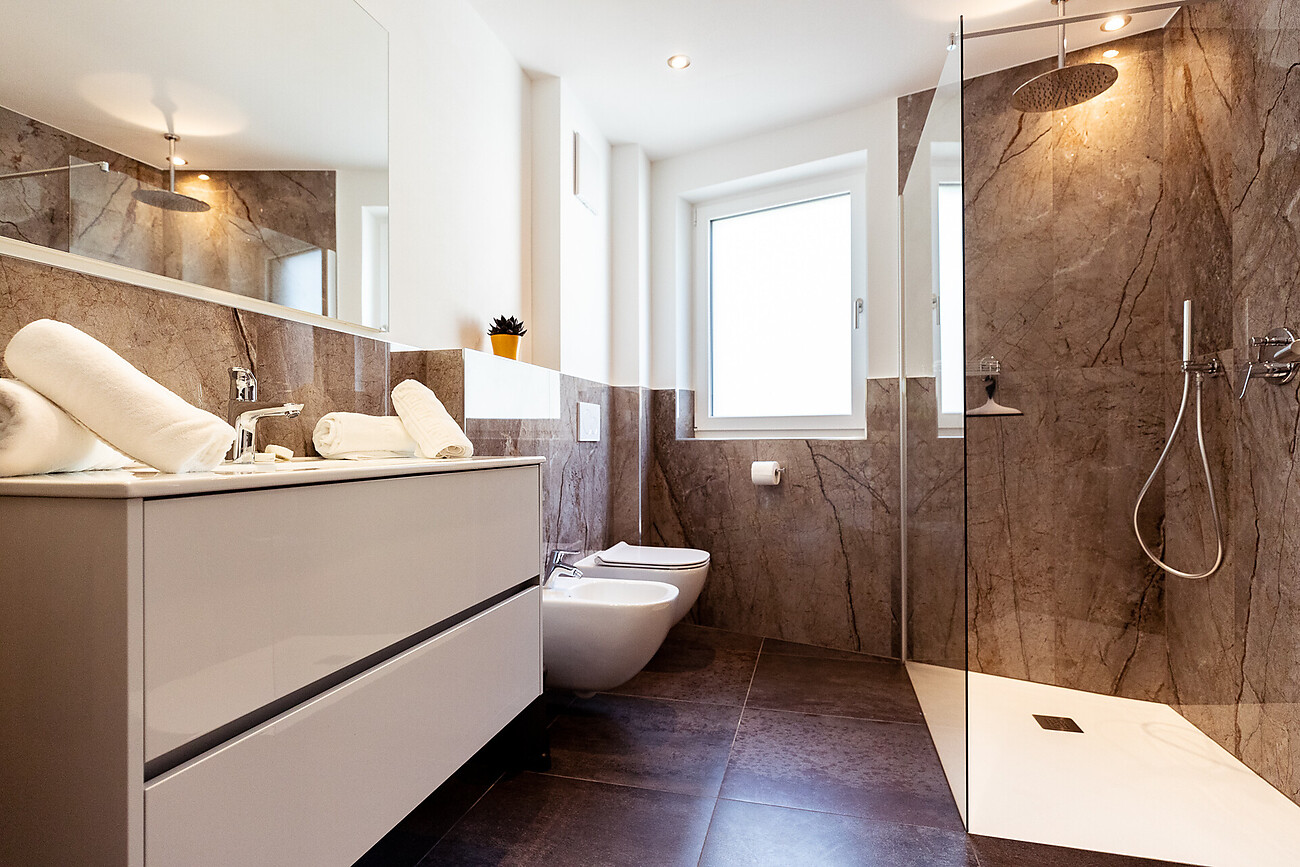 Das geräumige Badezimmer verfügt über eine Dusche, einem Bidet sowie einem Haartrockner.