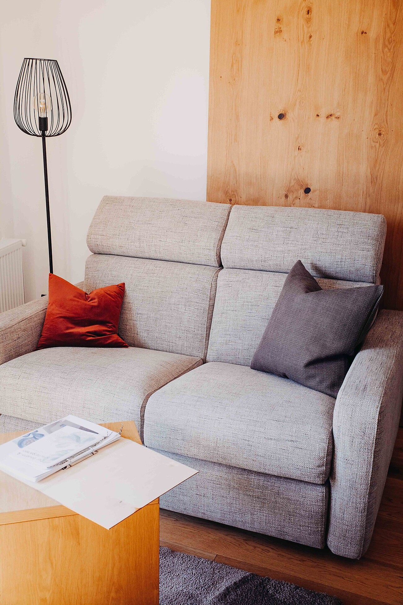 Warme, moderne Holzelemente, kombiniert mit alten, rustikalen Elementen, viel Platz zum Entspannen, eine Hofsauna mit Outdoordusche, einen großen Garten und jeweils ein Balkon mit dem wohl besten Blick über das Etschtal.