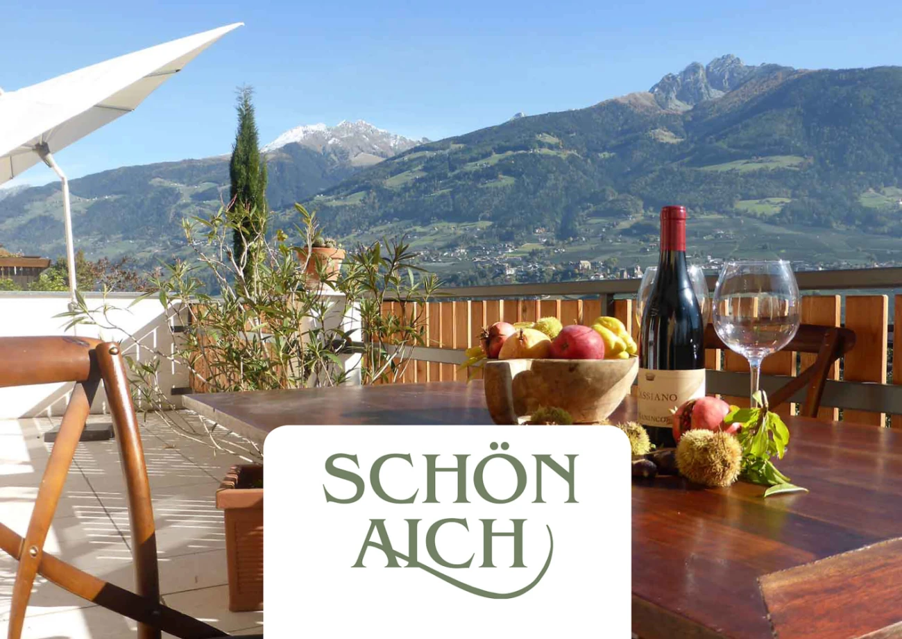 Genießen Sie den fantastischen Ausblick auf die Meraner Bergwelt auf Ihrer Sonnenterrasse mit Weinlaube.