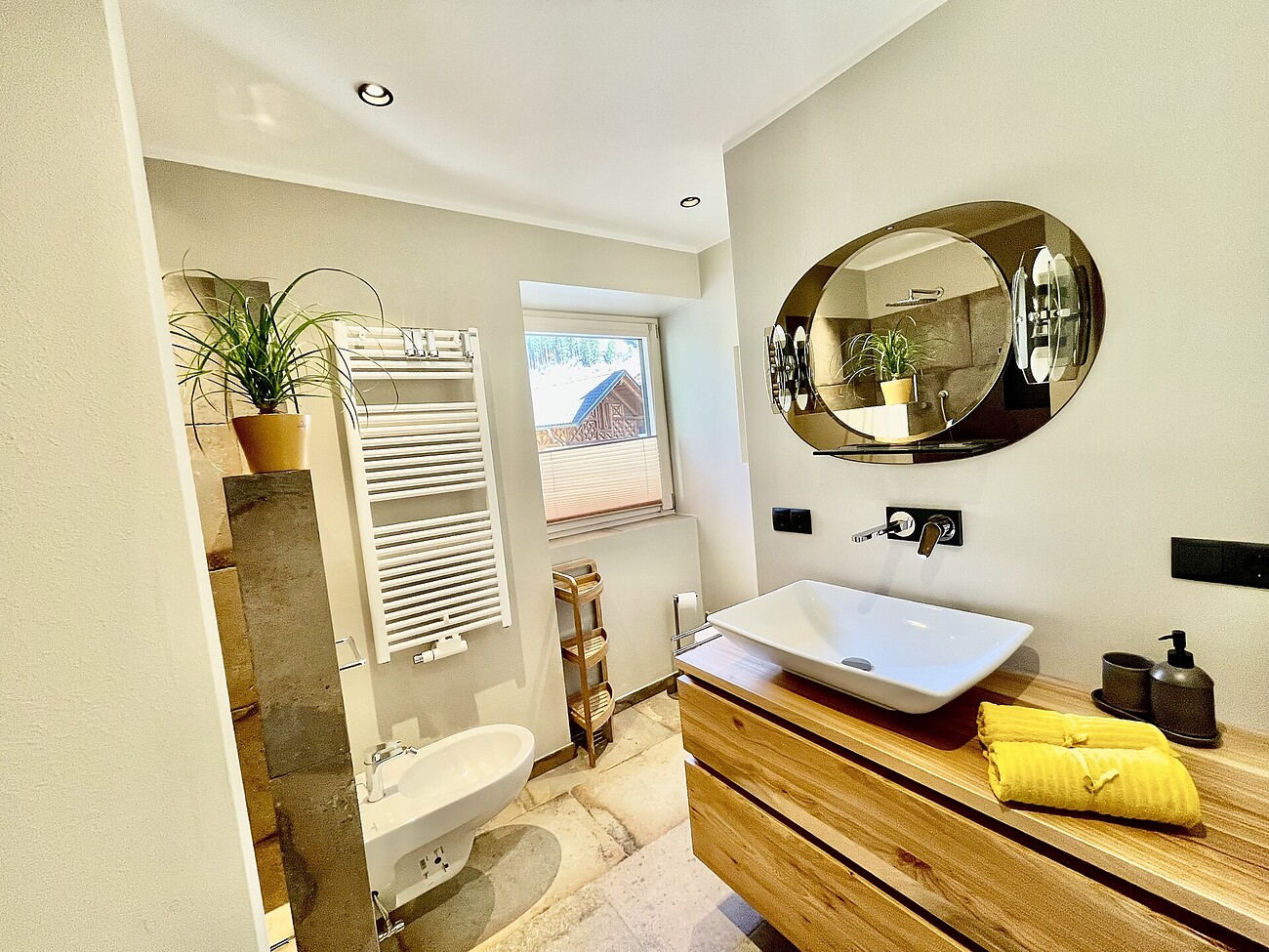 Das Badezimmer ist mit WC, Dusche, und Bidet ausgestattet.