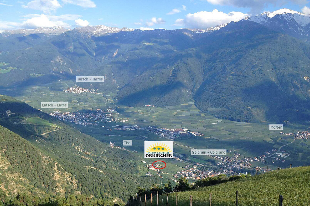 Unsere einmalig ruhige Lage am Sonnenhang, mit herrlichem Ausblick auf die Berge der Ortlergruppe und Ötztaler Alpen.