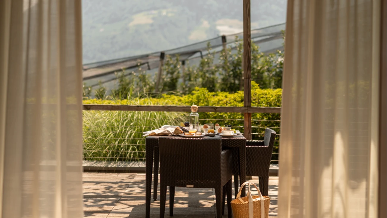 Nur wenige Autominuten von Meran, in wunderschöner Hanglage direkt am Algunder Waalweg schuf Matteo Thun mit Architektur und Design eine Oase der Ruhe inmitten der Natur. Die großzügigen Appartements mit traumhaftem Panoramablick auf das gesamte Etschtal laden ein die Landschaft zu genießen. Durch die Rebanlagen auf den Terrassen entfaltet sich das Gebäude mit den Jahreszeiten. Das Bedürfnis nach Ruhe und Entspannung wächst im selben Maß wie die Welt schneller, lauter und hektischer wird. Darum sehnen wir uns nach Orten der Kraft, wo wir uns regenerieren und Energie auftanken können. Dort reflektieren sich unsere Interessen, Gefühle und Visionen.Vom Innenhof ist jedes Appartement einzeln zugänglich und weist eine Wohnfläche von 64 m² auf. Die Wohnungen sind alle nach Süden ausgerichtet und haben eine Panoramaterrasse mit Pergel von 40 m². Natürliche Materialien wie Holz und Stein ergeben eine Symbiose von Natur und Wohnraum.