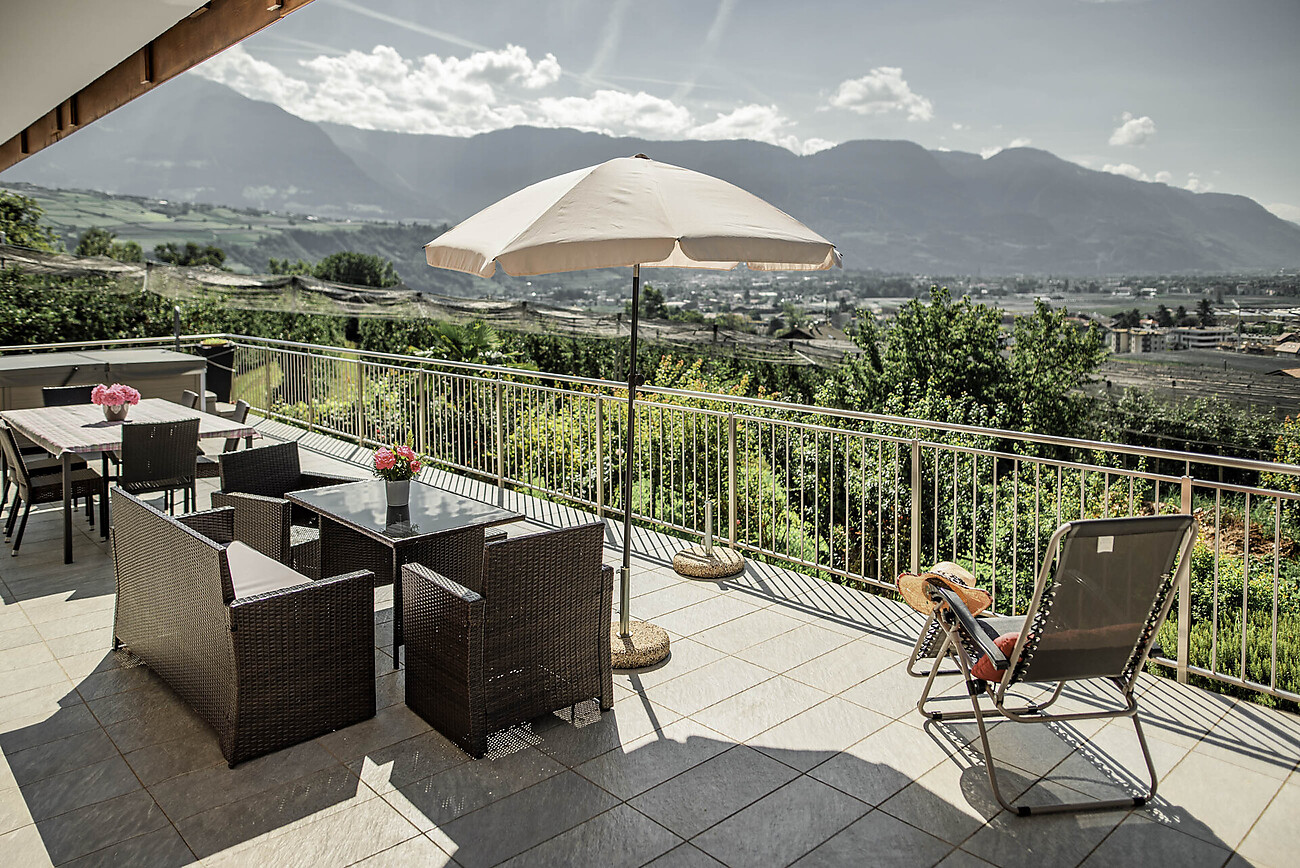 Our home “Panorama”, about 3 km from Merano, nestles in an apple orthard and is blessed with a view of both valley and snowcapped mountains. The appartments are situated in the midst of green meadows, orchards and vineyards. Enjoy the wonderful view over Meran and the Etsch Valley. Panorama is a house in which people love to come back.