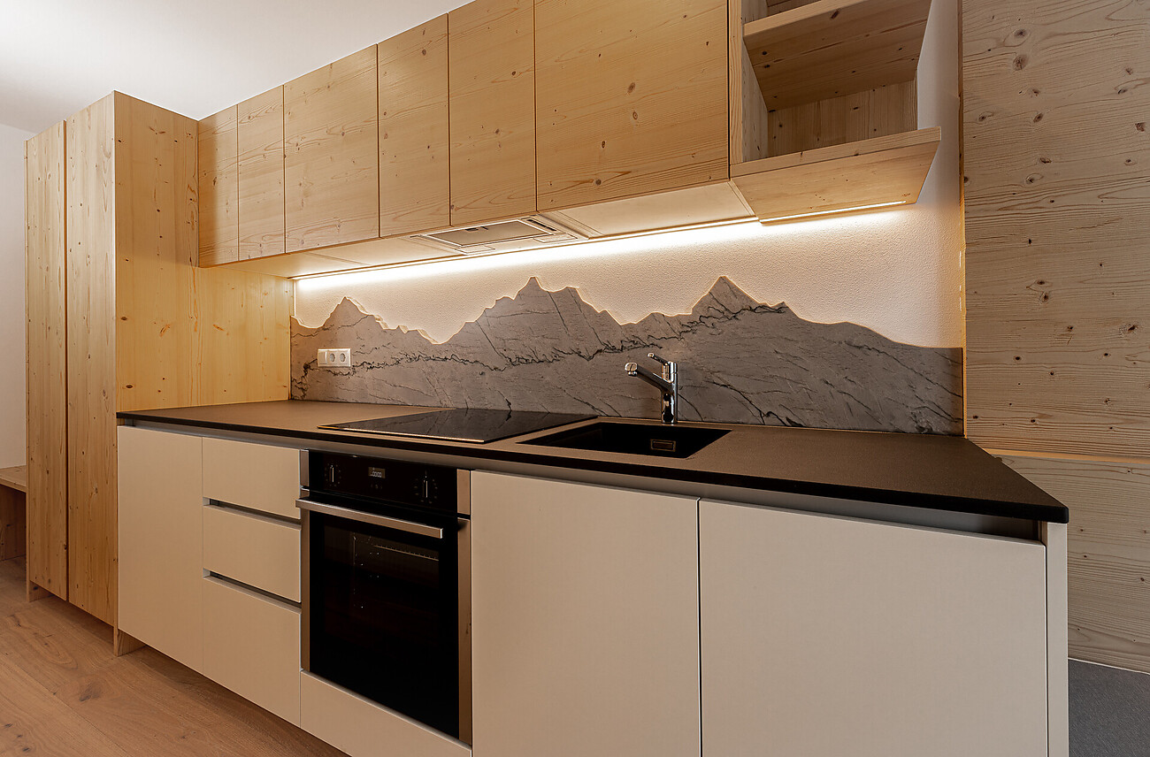 Elegant studio apartment Sesto/Moso, with direkt access on the cross-country ski piste , with balcony overlooking the wonderful panorama of the Meridiana Mountains. In this apartment on the mezzanine floor, the sleeping area with double bed is screened by a partition from the fully equipped kitchen. Bathroom with shower and washing machine. The offer is completed with a parking space in the garage with privat box. Pets are not allowed.