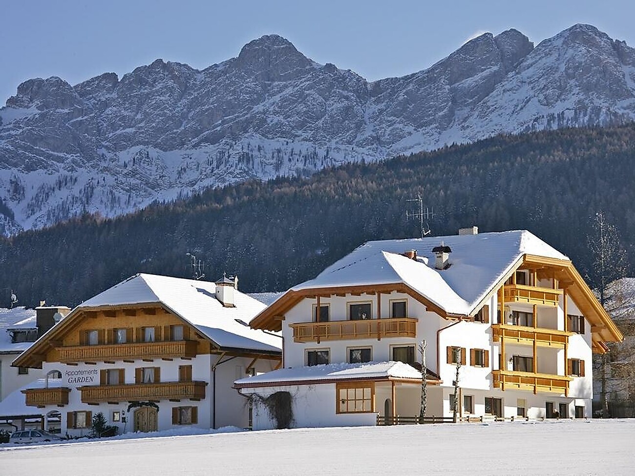 Our beautiful, sunny location offers a spectacular view of the impressive mountainscape of the Dolomites and Kronplatz.