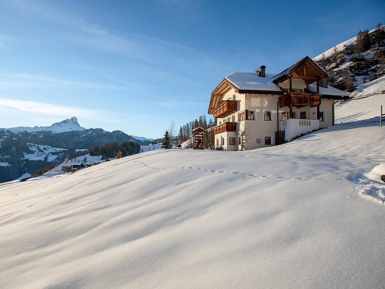 The house is located in a very quiet and sunny spot in La Val, surrounded by meadows and with a breathtaking view of Sas dla Crusc, the Puez group and Sasso Pütia.