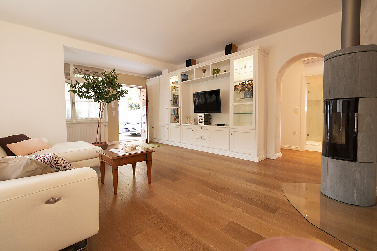A light-flooded living room, a well-equipped kitchen, spacious bedrooms, a daytime WC with a shower, and a bathroom with a bidet and a bathtub, as well as an inviting balcony, ensure familiar living comfort. Amenities such as modern air conditioning, a private parking space, and a separate laundry room with plenty of hanging space round off your stay.