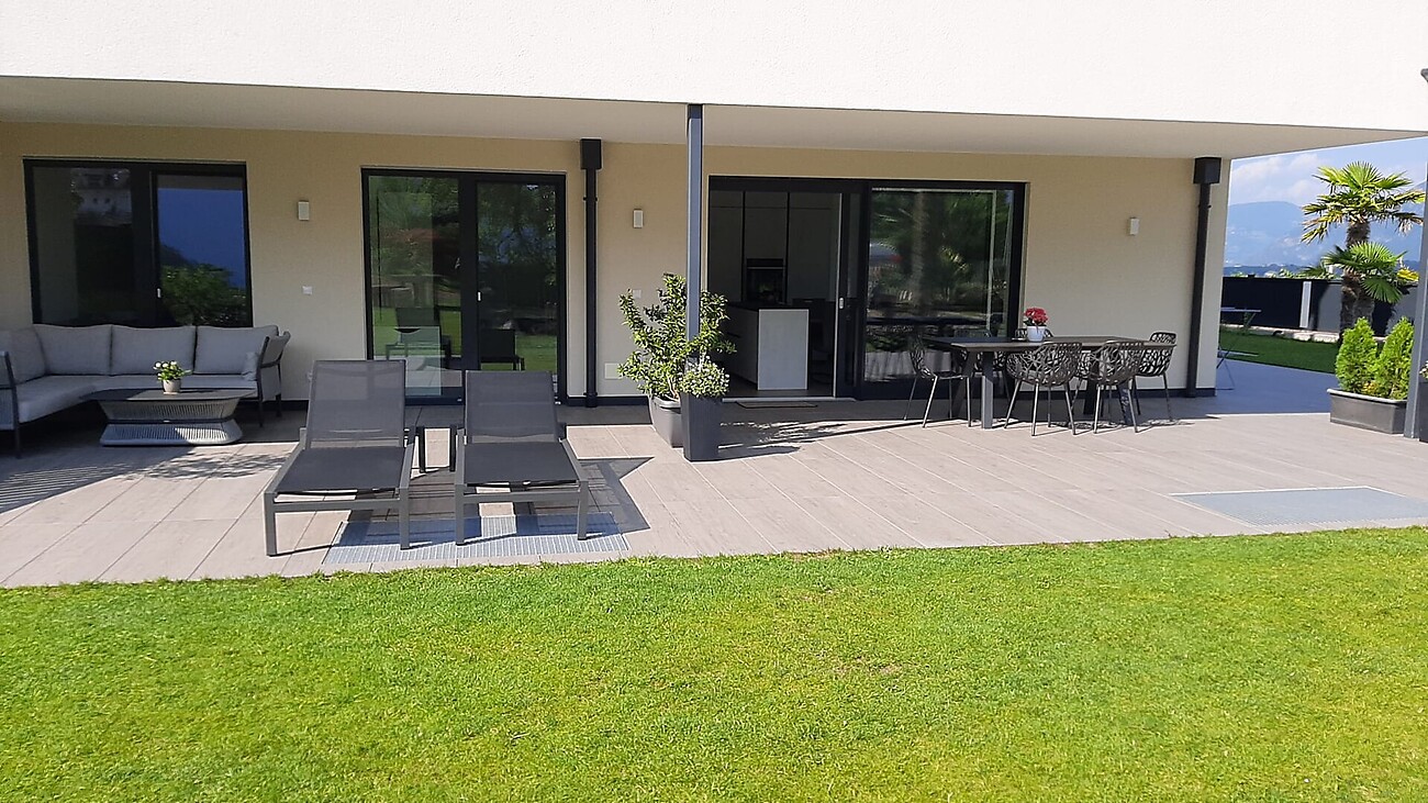 The second bathroom has a bathtub and there is also a washing machine. In the living room there is a sofa which can be converted into a double bed. The apartment has an outdoor parking space