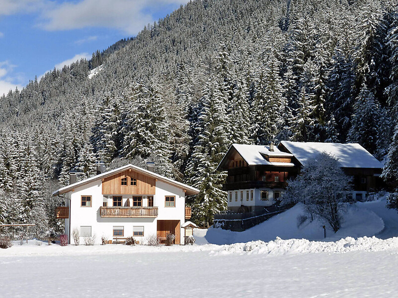 Our newly built holiday house next to our farm house was completed in 2008. There are two spacious apartments on the first floor. On two balconies per apartment you can enjoy the beautiful view of the valley. Solid wood furniture and wooden floors from local larch guarantee housing quality at the highest stage. The large lawn in front of our house, the playground and the garden with fresh herbs and vegetables make one’s heart flutter.