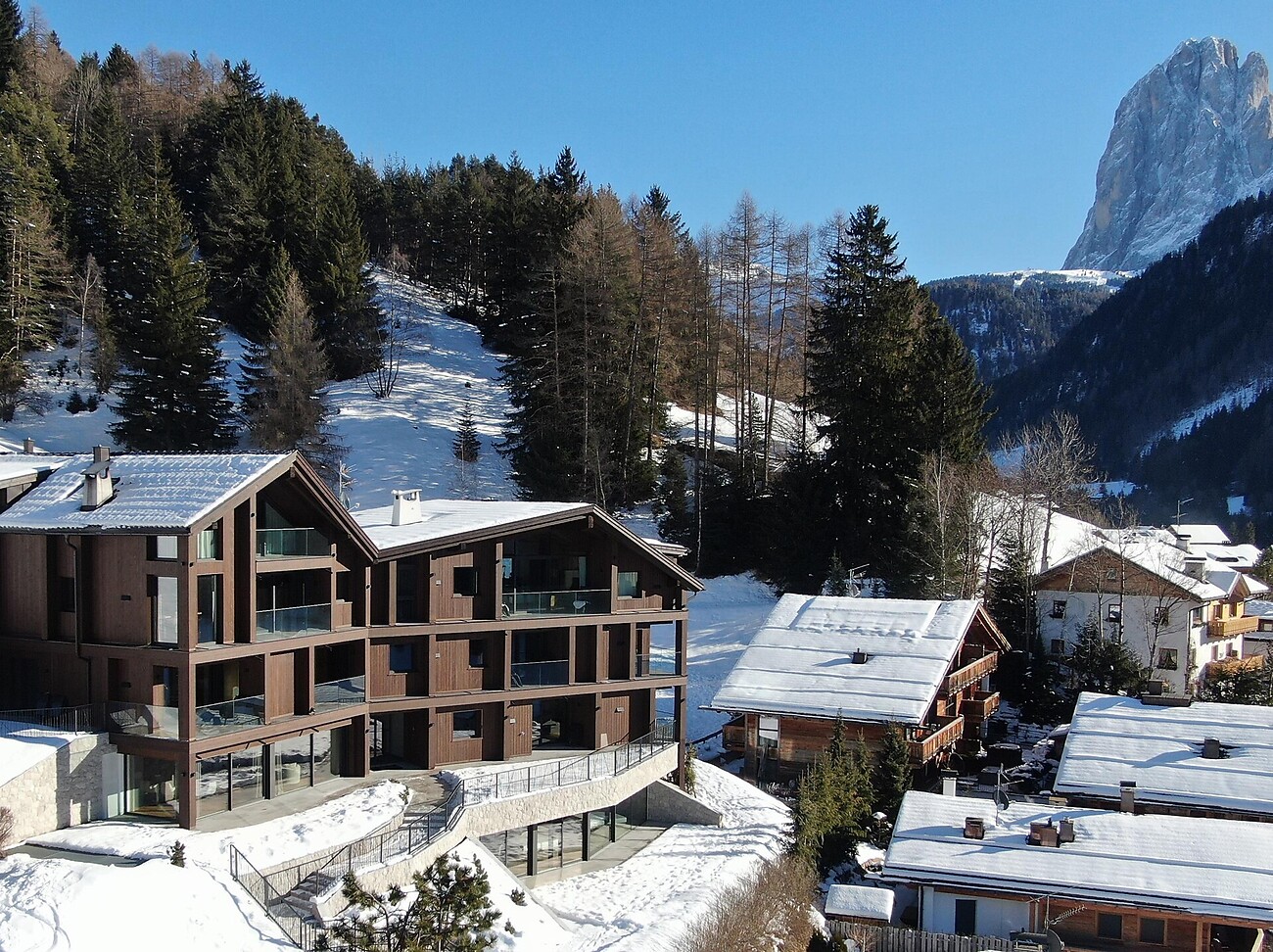 The new private chalet is located on the sunny edge of the Ortisei forest amidst green meadows.