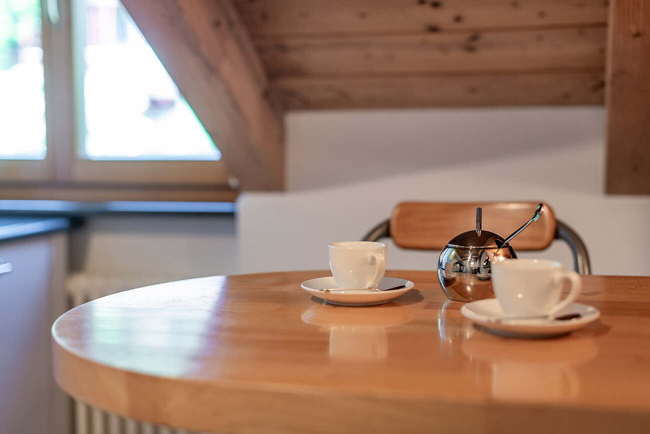 The apartment is located in a courtyard on the top floor of a stately building in a very quiet area with a wonderful view of the mountains, the flower gardens and the roofs of the village.