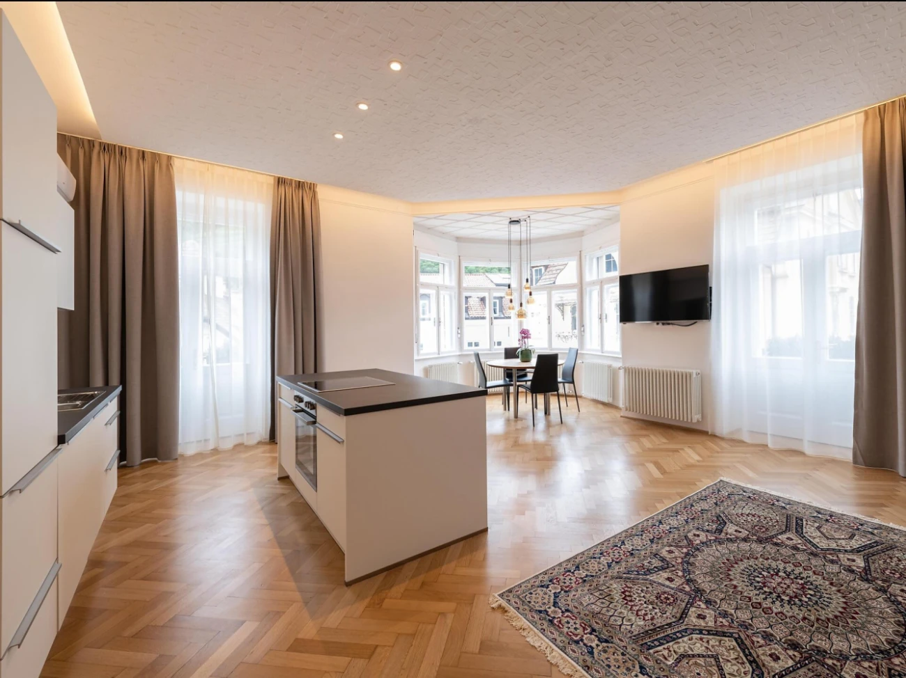 The suites are located on the third floor of a historic house with a lift. Each suite has a bedroom, a bathroom, a fully equipped kitchen, a large living room with two more sleeping options, a TV, Wi-Fi and a balcony with seating. From here you can enjoy a beautiful view of the surrounding mountains and the historic buildings.