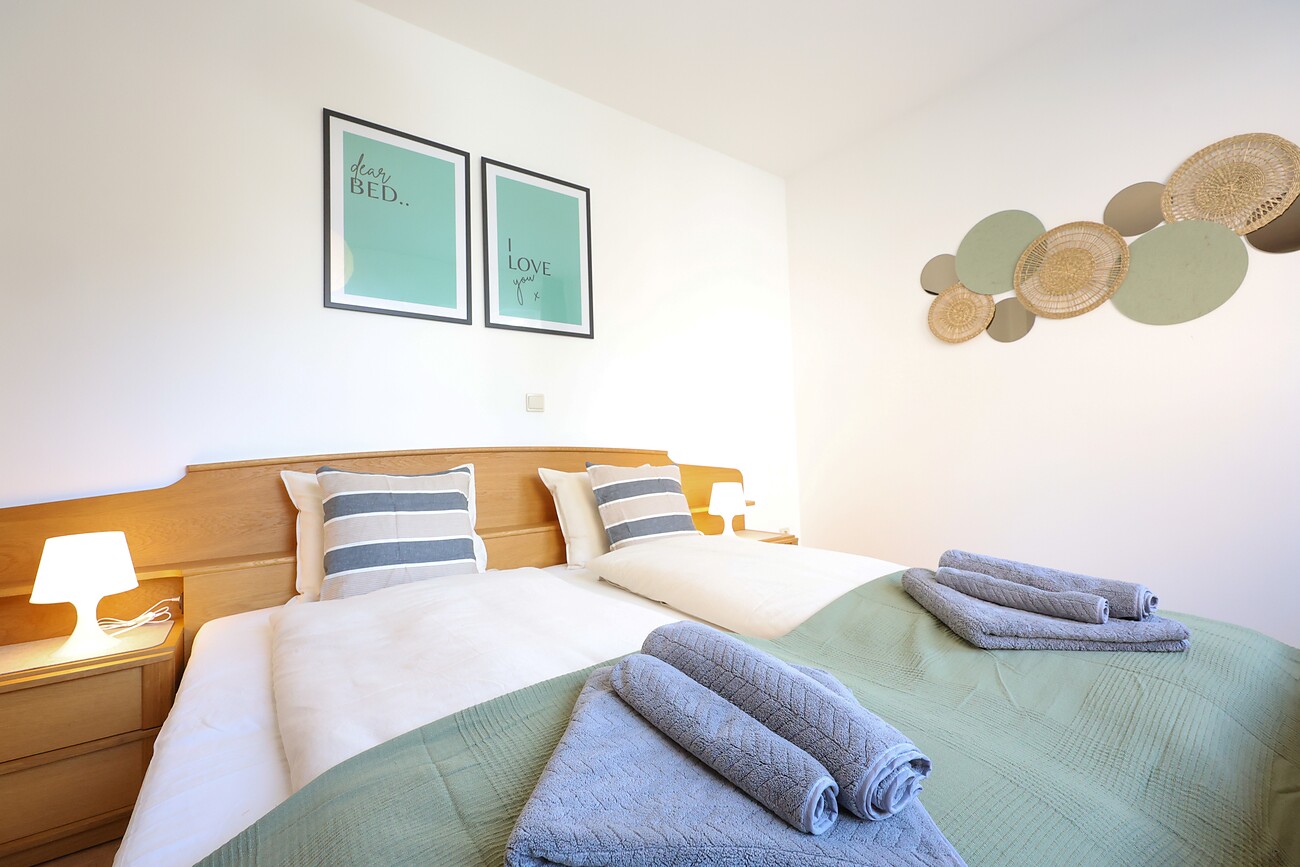 This bright bedroom features a comfortable king-size bed (180x200 cm) with high-quality mattresses. A spacious wardrobe provides plenty of storage, while the two large windows let in fresh air and natural light. It’s the perfect retreat to unwind after an eventful day and recharge your energy.