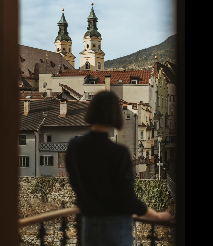 Suite 10 on the 2nd floor has 2 bedrooms, 2 bathrooms and a living room with a double sofa bed. The suite offers a breathtaking view of Bressanone's landmark, the White Tower. Free wellness bag in the suite for the small sauna in the house or for pleasant hours in the Acquarena just 300 metres away (special packages available from our reception).