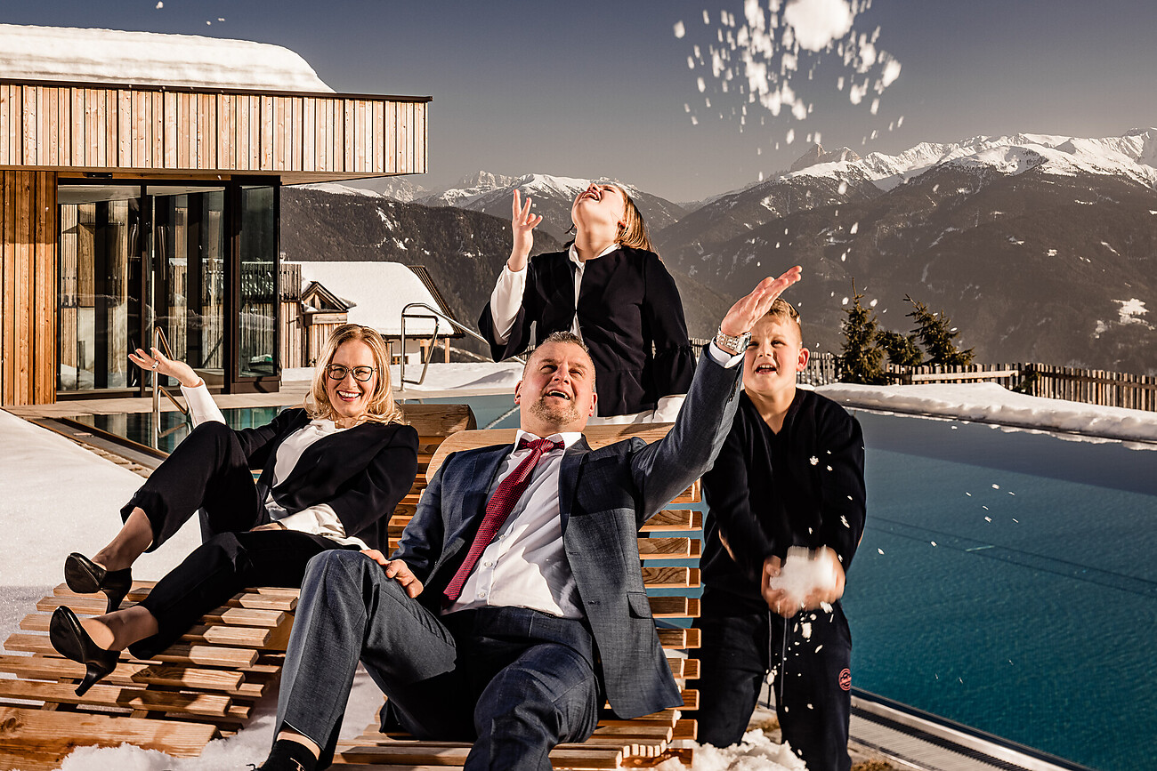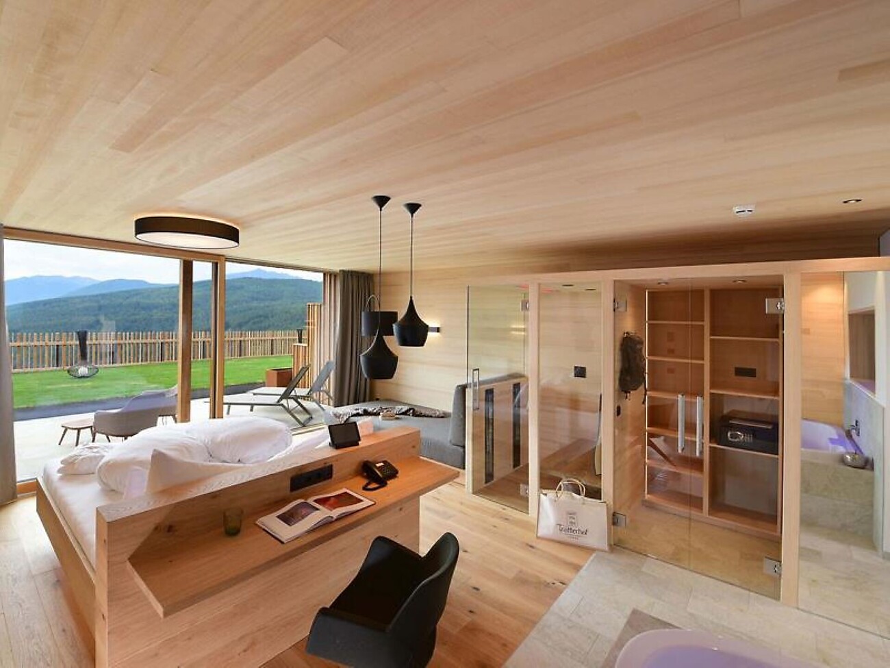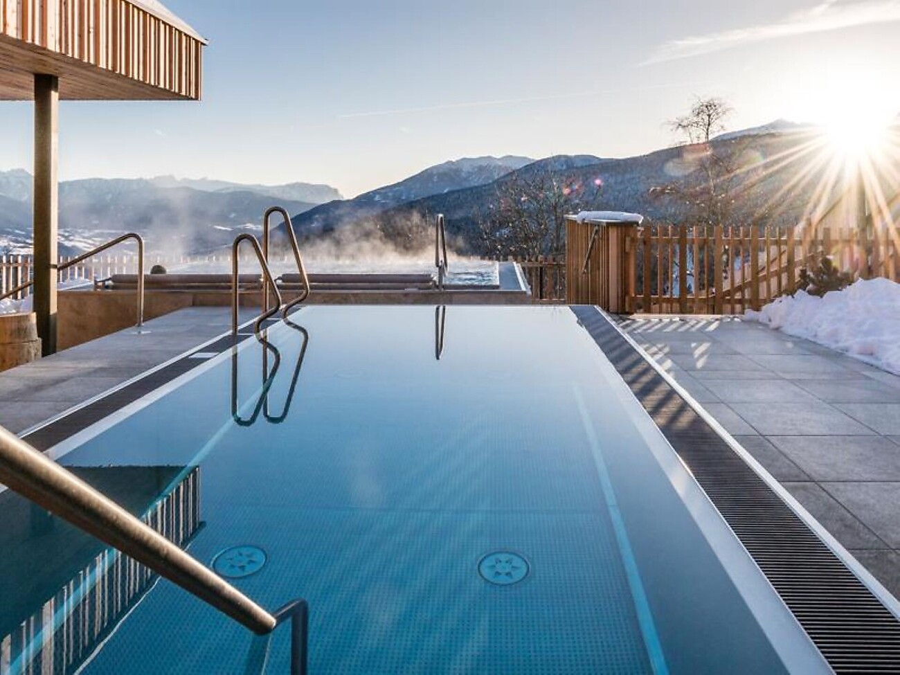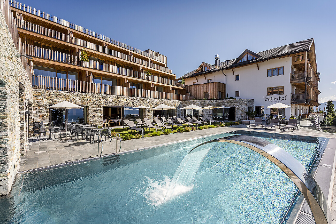 The luxurious Tratterhof at 1,500 metres above the South Tyrolean Eisacktal and Pustertal valleys trumps with its location at the box seat of the Dolomites. The view of the majestic peaks of the so-called "Pale Mountains" causes daily amazement among its guests: Sasso Putia, Cime Odle, Sasso Lungo, Sasso Piatto and Sciliar - immersed in the various colour games of the sun - adorn the wide window facades of the Tratterhof suites and appear at eye level with the observer. The spacious suites of the terrace hotel are harmoniously integrated into the natural terrain of the Pfunderer mountains, which can be explored car-free directly from the hotel via the rustic Altfasstal valley. The individual terrace design of the Tratterhof offers every guest plenty of space, the magical feeling of freedom in the mountain sky and, above all, lots of sun all day long. At the same time, in this way the luxury suites guarantee maximum privacy without sacrificing endless views. The light-flooded wellness world of the Monte Silva Spa has several outdoor pools, an indoor pool and eight different saunas including a show sauna. In the hotel's beauty farm, most of the wellness treatments take place using the hotel's own Monte Silva Cura natural cosmetics line. A clear separation between adults-only areas and family saunas enables the best possible relaxation in the spa amidst the alpine and sun-drenched nature of the hotel. As a family-run wellness and hiking hotel, the Mountain Sky Hotel Tratterhof enjoys top ratings from its guests on all renowned portals. The sumptuous breakfast buffet, the multi-course evening menu, the utmost cleanliness in all areas and the familiar ambience play an important role, as do the absolute premium location and the unbeatable wellness offer. The host family Gruber-Hinteregger has been watching over the entire service offer with dedication and passion for generations.