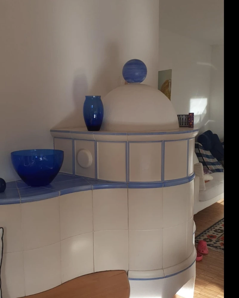 Surrounded by fruit trees and ornamental plants, the small country house has 4 beds, a bathroom, a kitchen, a living room with a tiled stove and a small infrared sauna. There are plenty of outdoor seating and lounging areas on the large terrace and in the