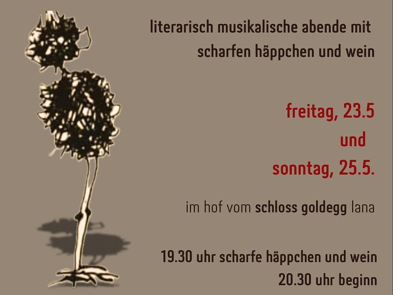 Die Singgruppe Madlain und peperovino laden zu musikalischen und literarischen Abende mit schafen Häppchen und Wein im Schloss Goldegg ein
