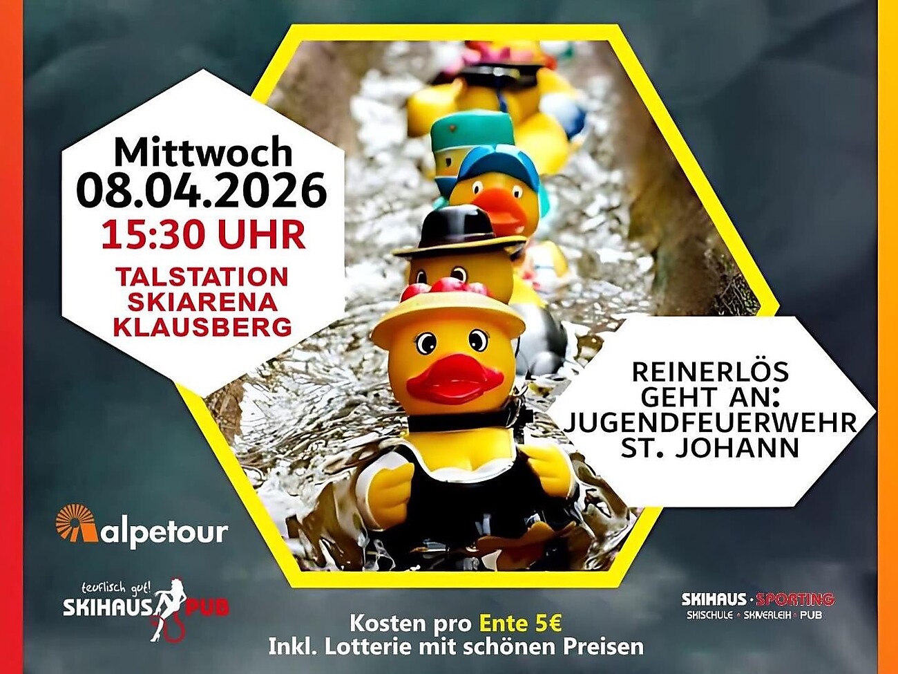 Duck purchase at the Klausberg ski school; Price per duck: €5 (including participation in the lottery with great prizes). The net proceeds goes to the St. Johann Youth Fire Brigade