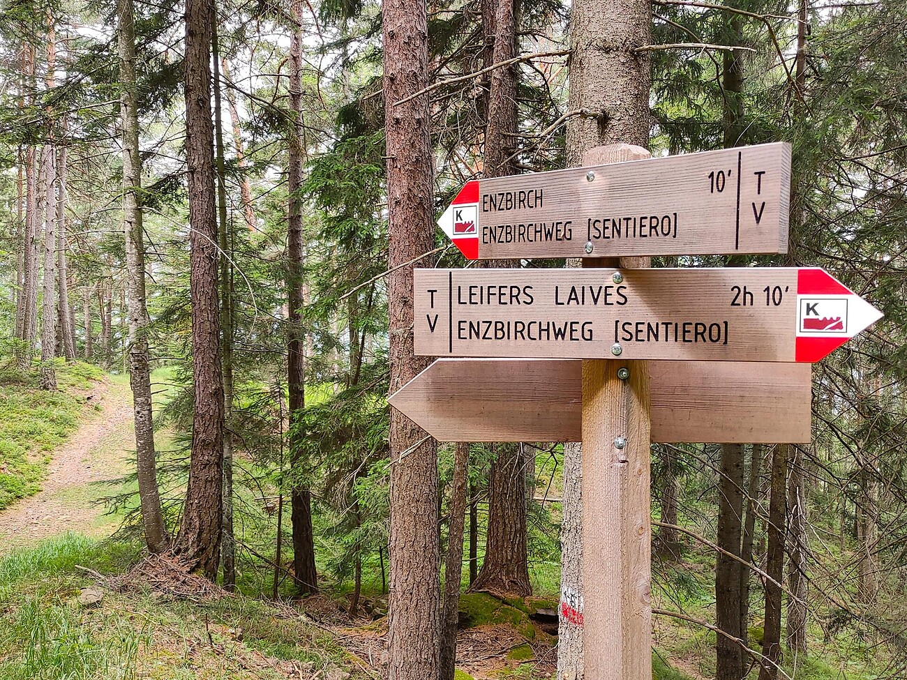Please note: there are no parking facilities at Hochegg and Enzbirg. A free shuttle bus runs every 15 minutes from Laives (Kindergarten in Via Pietralba) to Hochegg. From Deutschnofen, Enzbirg can be reached from the Schadnerhof farm (1.5 km, 30 minutes, 10 m ascent). Parking is available at Schadnerhof and Höggerhof.