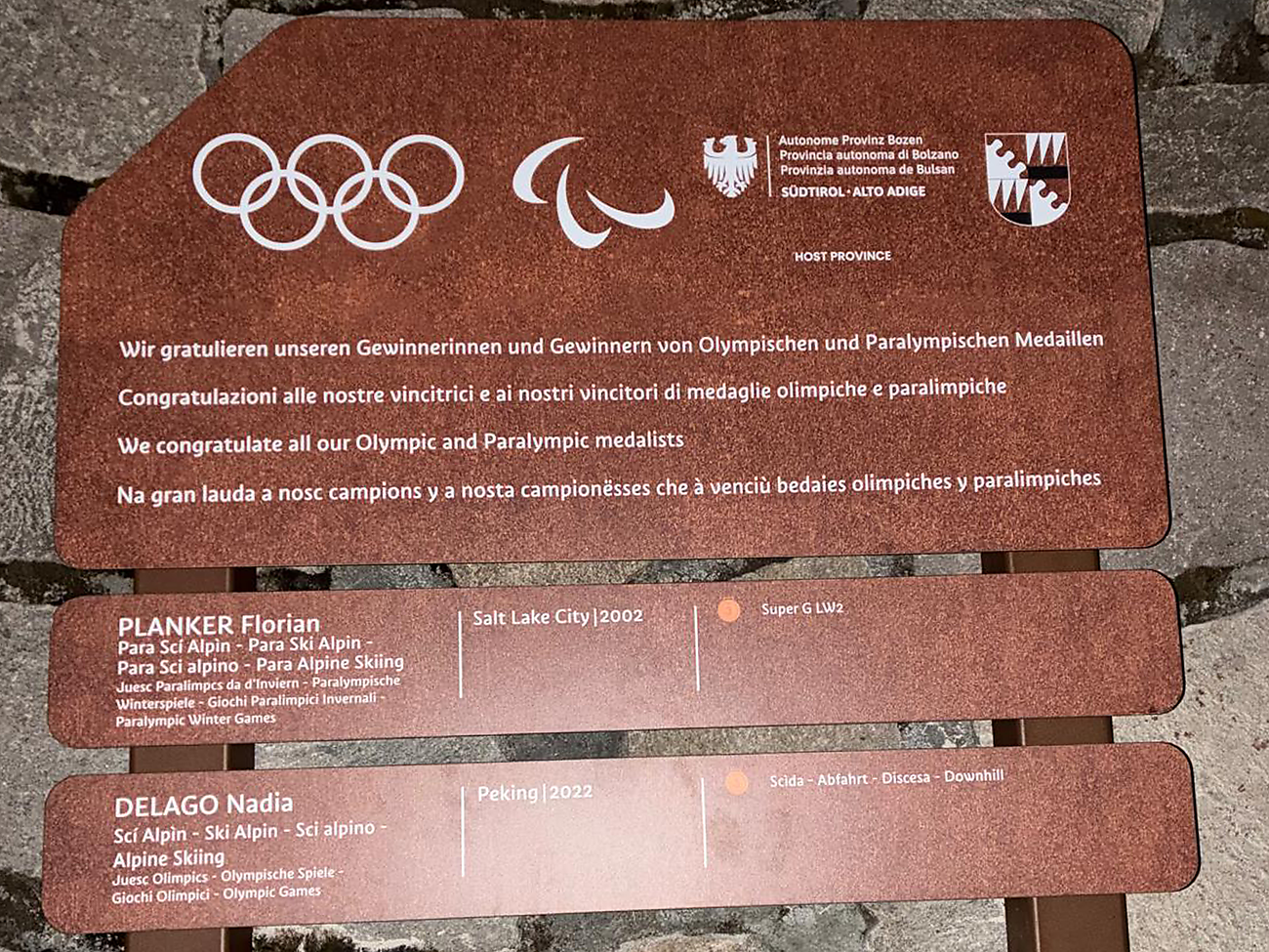The plaque will immortalise in bronze the two Olympic medallists from Selva Val Gardena: Nadia Delago, bronze medallist in alpine skiing (downhill) at the Beijing 2022 Winter Olympics, and Florian Planker, bronze medallist in Para Alpine Skiing (Super-G LW2) at the Salt Lake City 2002 Winter Paralympics.